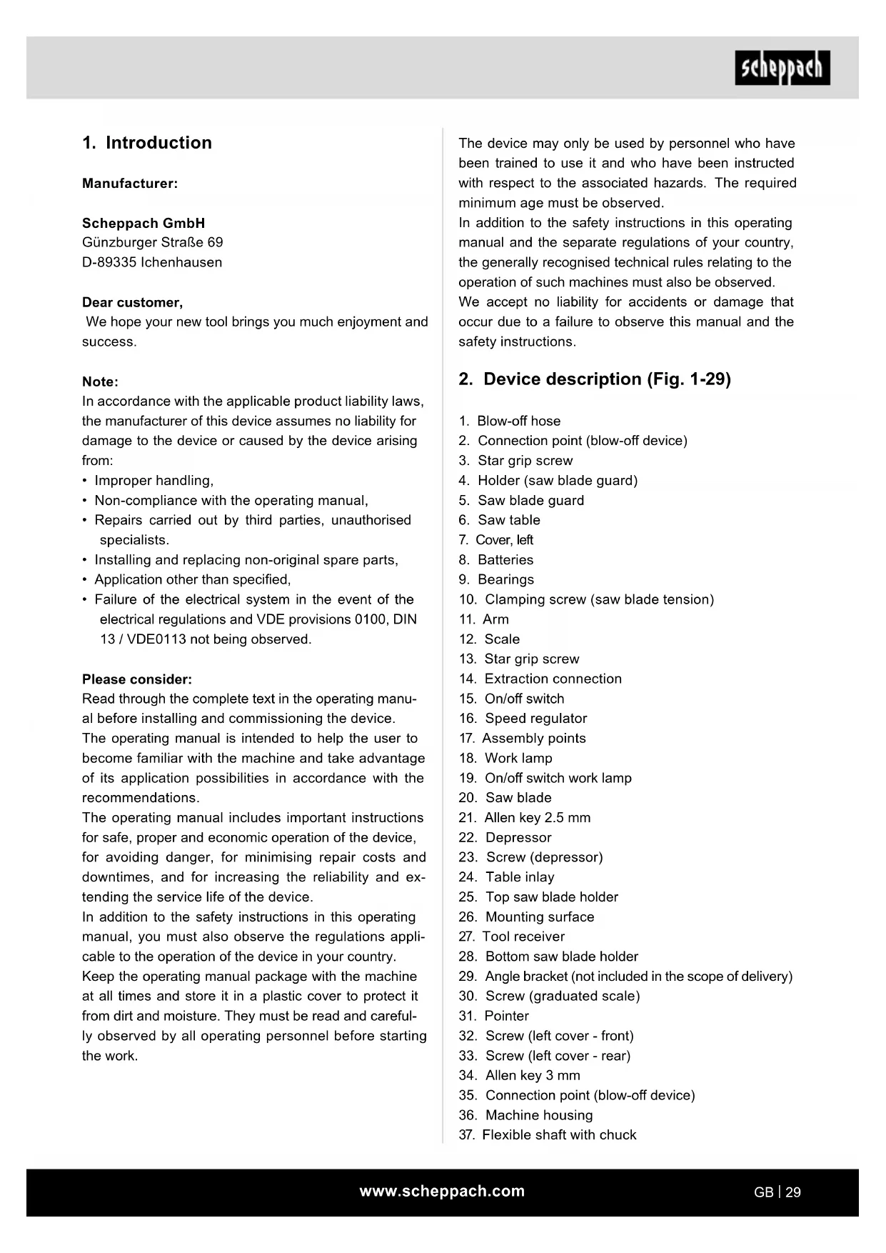 Manufacturer: Scheppach GmbH Günzburger Straße 69 D-89335 Ichenhausen Dear customer, We hope your new tool brings you much enjoyment and success. Note: In accordance with the applicable product liability laws, the manufacturer of this device assumes no liability for damage to the device or caused by the device arising from: