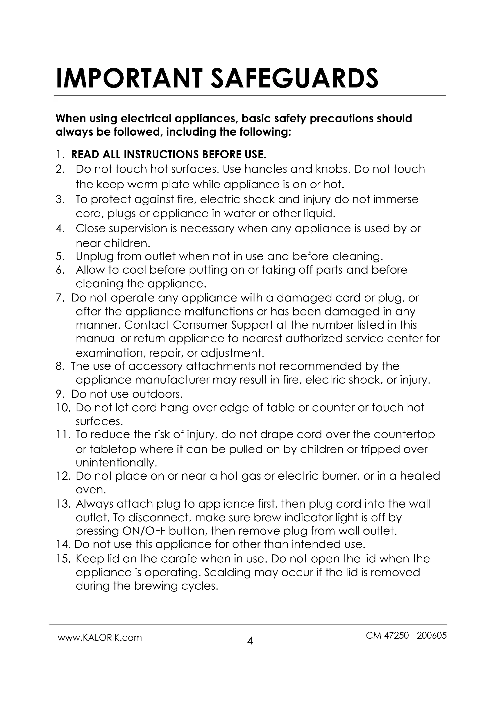 CM 47250 - 200605 www.KALORIK.com IMPORTANT SAFEGUARDS When using electrical appliances, basic safety precautions should always be followed, including the following: