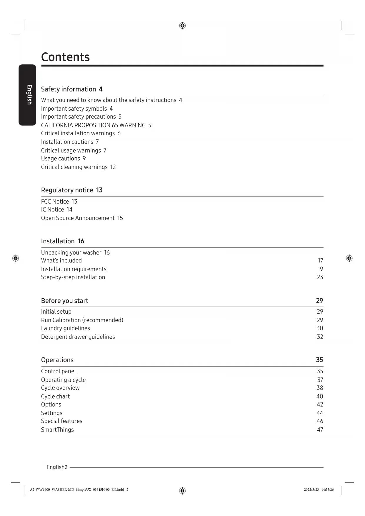 Critical installation warnings 6 Installation cautions 7 Critical usage warnings 7 Usage cautions 9 Critical cleaning warnings 12 Regulatory notice 13 FCC Notice 13 IC Notice 14 Open Source Announcement 15 Installation 16 Unpacking your washer 16 What’s included 17 Installation requirements 19 Step-by-step installation 23 Before you start 29 Initial setup 29 Run Calibration (recommended) 29 Laundry guidelines 30 Detergent drawer guidelines 32 Operations 35 Control panel 35 Operating a cycle 37 Cycle overview 38 Cycle chart 40 Options 42 Settings 44 Special features 46 SmartThings 47 A2-WW6900_WASHER-MD_SimpleUX_03645H-00_EN.indd 2 2022/5/23 14:55:26English English 3 Maintenance 48 Self Clean+ 48 Emergency drain 49 Cleaning 50 Care for an extended period of non-use 54 Cleaning the exterior 54 Cleaning the interior 54 Troubleshooting 55 Checkpoints 55 Information codes 59 Specifications 62 Fabric care chart 62 Protecting the environment 63 Declaration of conformity 63 Specification sheet 63 A2-WW6900_WASHER-MD_SimpleUX_03645H-00_EN.indd 3 2022/5/23 14:55:26English Safety information