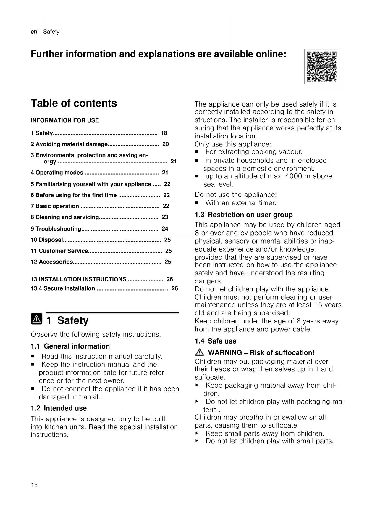 1 Safety Observe the following safety instructions. 1.1 General information ¡ Read this instruction manual carefully. ¡ Keep the instruction manual and the product information safe for future refer- ence or for the next owner. ¡ Do not connect the appliance if it has been damaged in transit. 1.2 Intended use This appliance is designed only to be built into kitchen units. Read the special installation instructions. The appliance can only be used safely if it is correctly installed according to the safety in- structions. The installer is responsible for en- suring that the appliance works perfectly at its installation location. Only use this appliance: ¡ For extracting cooking vapour. ¡ in private households and in enclosed spaces in a domestic environment. ¡ up to an altitude of max. 4000m above sea level. Do not use the appliance: ¡ With an external timer. 1.3 Restriction on user group This appliance may be used by children aged 8 or over and by people who have reduced physical, sensory or mental abilities or inad- equate experience and/or knowledge, provided that they are supervised or have been instructed on how to use the appliance safely and have understood the resulting dangers. Do not let children play with the appliance. Children must not perform cleaning or user maintenance unless they are at least 15 years old and are being supervised. Keep children under the age of 8 years away from the appliance and power cable. 1.4 Safe use WARNING‒Risk of suffocation! Children may put packaging material over their heads or wrap themselves up in it and suffocate. ▶ Keep packaging material away from chil- dren. ▶ Do not let children play with packaging ma- terial. Children may breathe in or swallow small parts, causing them to suffocate. ▶ Keep small parts away from children. ▶ Do not let children play with small parts.Safety en