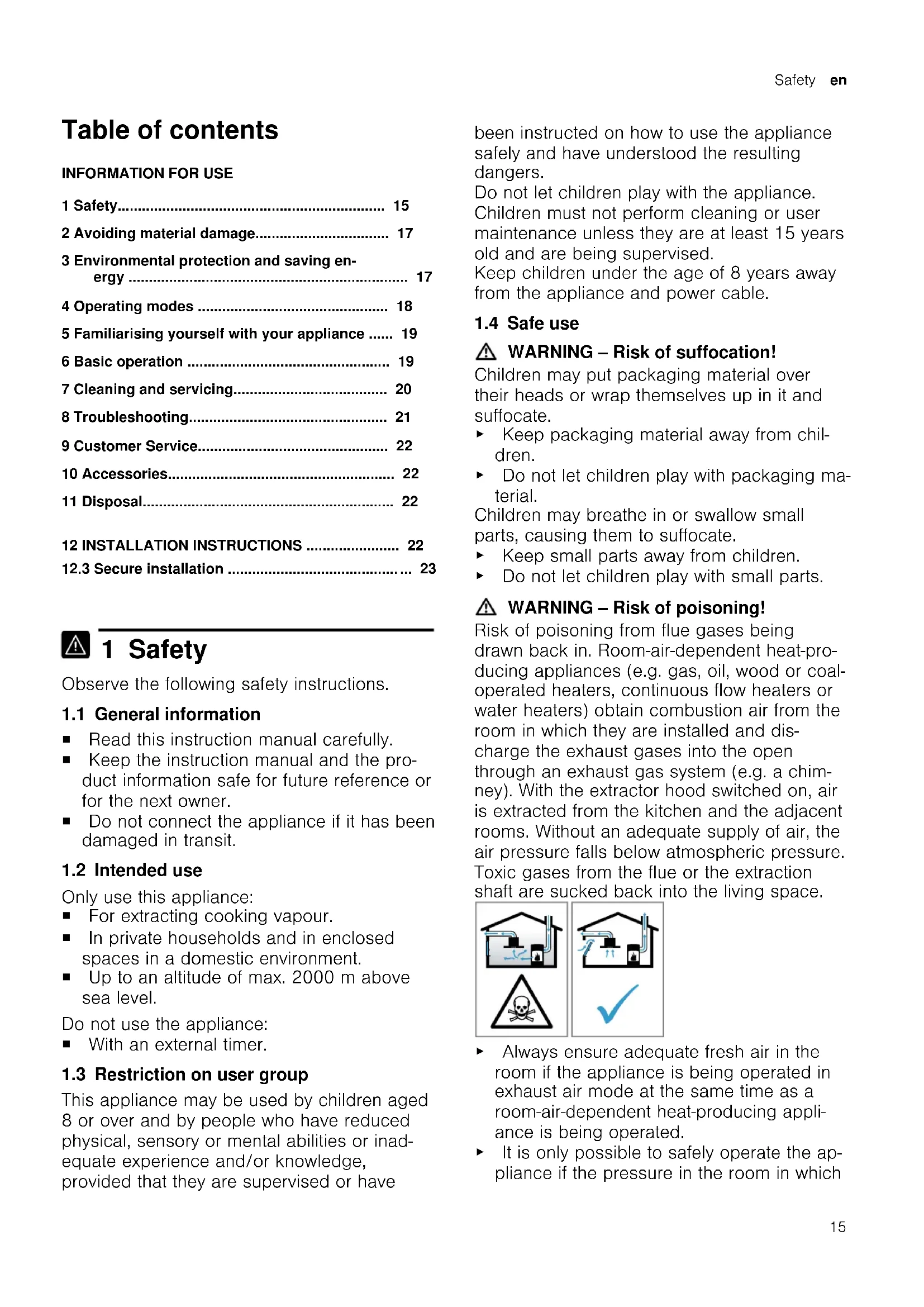 1 Safety Observe the following safety instructions. 1.1 General information ¡ Read this instruction manual carefully. ¡ Keep the instruction manual and the pro- duct information safe for future reference or for the next owner. ¡ Do not connect the appliance if it has been damaged in transit. 1.2 Intended use Only use this appliance: ¡ For extracting cooking vapour. ¡ In private households and in enclosed spaces in a domestic environment. ¡ Up to an altitude of max. 2000m above sea level. Do not use the appliance: ¡ With an external timer. 1.3 Restriction on user group This appliance may be used by children aged 8 or over and by people who have reduced physical, sensory or mental abilities or inad- equate experience and/or knowledge, provided that they are supervised or have been instructed on how to use the appliance safely and have understood the resulting dangers. Do not let children play with the appliance. Children must not perform cleaning or user maintenance unless they are at least 15 years old and are being supervised. Keep children under the age of 8 years away from the appliance and power cable. 1.4 Safe use WARNING‒Risk of suffocation! Children may put packaging material over their heads or wrap themselves up in it and suffocate. ▶ Keep packaging material away from chil- dren. ▶ Do not let children play with packaging ma- terial. Children may breathe in or swallow small parts, causing them to suffocate. ▶ Keep small parts away from children. ▶ Do not let children play with small parts. WARNING‒Risk of poisoning! Risk of poisoning from flue gases being drawn back in. Room-air-dependent heat-pro- ducing appliances (e.g. gas, oil, wood or coal- operated heaters, continuous flow heaters or water heaters) obtain combustion air from the room in which they are installed and dis- charge the exhaust gases into the open through an exhaust gas system (e.g. a chim- ney). With the extractor hood switched on, air is extracted from the kitchen and the adjacent rooms. Without an adequate supply of air, the air pressure falls below atmospheric pressure. Toxic gases from the flue or the extraction shaft are sucked back into the living space. ▶ Always ensure adequate fresh air in the room if the appliance is being operated in exhaust air mode at the same time as a room-air-dependent heat-producing appli- ance is being operated. ▶ It is only possible to safely operate the ap- pliance if the pressure in the room in whichen Safety