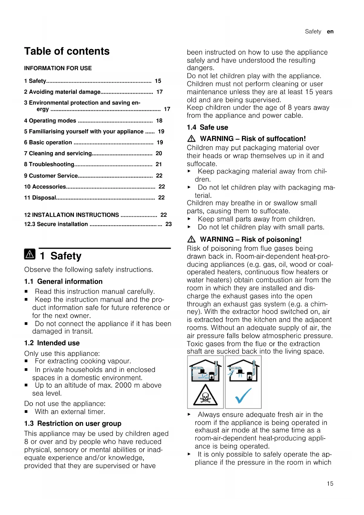 1 Safety Observe the following safety instructions. 1.1 General information ¡ Read this instruction manual carefully. ¡ Keep the instruction manual and the pro- duct information safe for future reference or for the next owner. ¡ Do not connect the appliance if it has been damaged in transit. 1.2 Intended use Only use this appliance: ¡ For extracting cooking vapour. ¡ In private households and in enclosed spaces in a domestic environment. ¡ Up to an altitude of max. 2000m above sea level. Do not use the appliance: ¡ With an external timer. 1.3 Restriction on user group This appliance may be used by children aged 8 or over and by people who have reduced physical, sensory or mental abilities or inad- equate experience and/or knowledge, provided that they are supervised or have been instructed on how to use the appliance safely and have understood the resulting dangers. Do not let children play with the appliance. Children must not perform cleaning or user maintenance unless they are at least 15 years old and are being supervised. Keep children under the age of 8 years away from the appliance and power cable. 1.4 Safe use WARNING‒Risk of suffocation! Children may put packaging material over their heads or wrap themselves up in it and suffocate. ▶ Keep packaging material away from chil- dren. ▶ Do not let children play with packaging ma- terial. Children may breathe in or swallow small parts, causing them to suffocate. ▶ Keep small parts away from children. ▶ Do not let children play with small parts. WARNING‒Risk of poisoning! Risk of poisoning from flue gases being drawn back in. Room-air-dependent heat-pro- ducing appliances (e.g. gas, oil, wood or coal- operated heaters, continuous flow heaters or water heaters) obtain combustion air from the room in which they are installed and dis- charge the exhaust gases into the open through an exhaust gas system (e.g. a chim- ney). With the extractor hood switched on, air is extracted from the kitchen and the adjacent rooms. Without an adequate supply of air, the air pressure falls below atmospheric pressure. Toxic gases from the flue or the extraction shaft are sucked back into the living space. ▶ Always ensure adequate fresh air in the room if the appliance is being operated in exhaust air mode at the same time as a room-air-dependent heat-producing appli- ance is being operated. ▶ It is only possible to safely operate the ap- pliance if the pressure in the room in whichen Safety