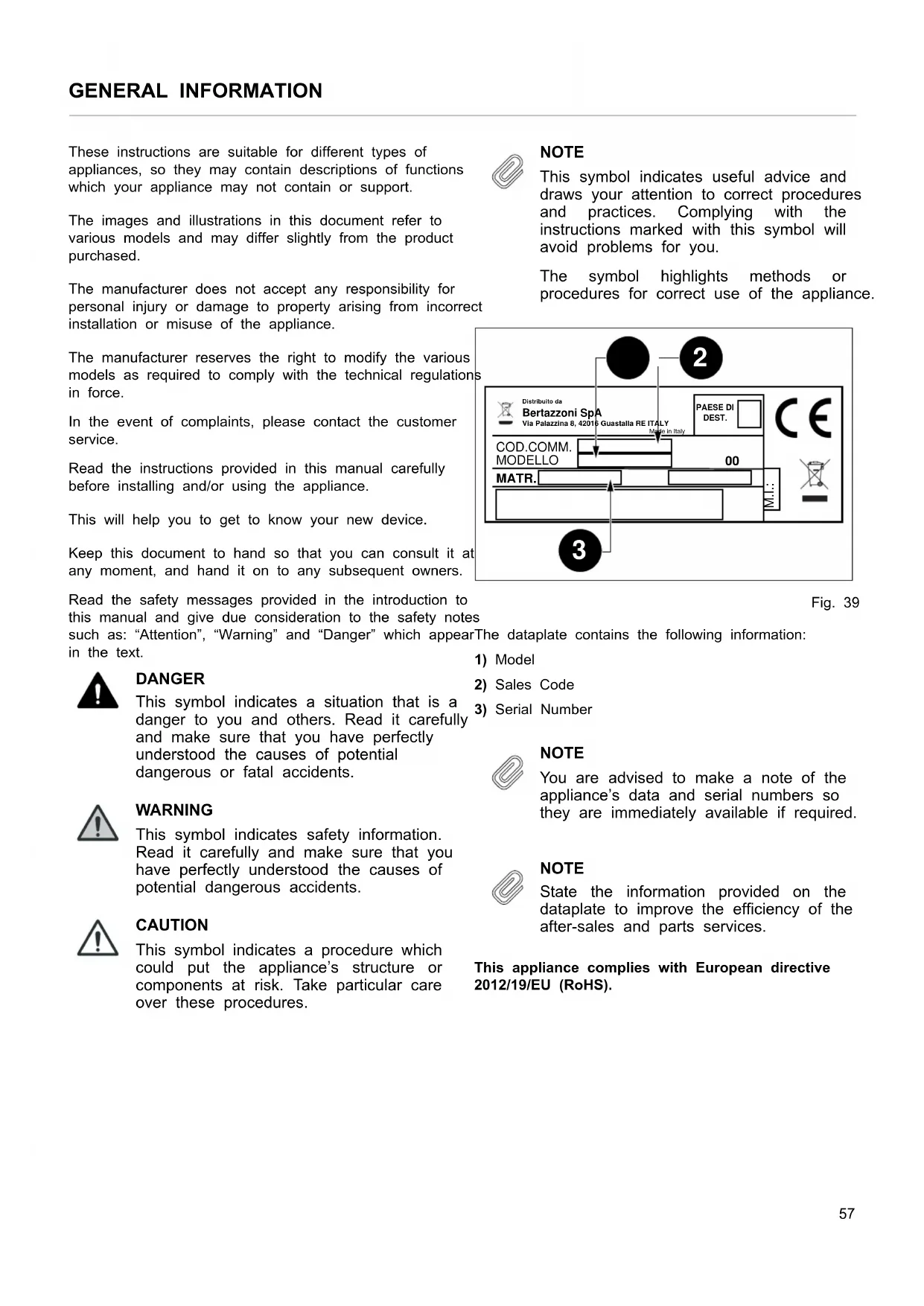 - PRODUCT MODEL: where can I find it? GENERAL INFORMATION These instructions are suitable for different types of appliances, so they may contain descriptions of functions which your appliance may not contain or support. The images and illustrations in this document refer to various models and may differ slightly from the product purchased. The manufacturer does not accept any responsibility for personal injury or damage to property arising from incorrect installation or misuse of the appliance. The manufacturer reserves the right to modify the various models as required to comply with the technical regulations in force. In the event of complaints, please contact the customer service. Read the instructions provided in this manual carefully before installing and/or using the appliance. This will help you to get to know your new device. Keep this document to hand so that you can consult it at any moment, and hand it on to any subsequent owners. Read the safety messages provided in the introduction to this manual and give due consideration to the safety notes such as: “Attention”, “Warning” and “Danger” which appear in the text. DANGER This symbol indicates a situation that is a danger to you and others. Read it carefully and make sure that you have perfectly understood the causes of potential dangerous or fatal accidents. WARNING This symbol indicates safety information. Read it carefully and make sure that you have perfectly understood the causes of potential dangerous accidents. CAUTION This symbol indicates a procedure which could put the appliance’s structure or components at risk. Take particular care over these procedures. NOTE This symbol indicates useful advice and draws your attention to correct procedures and practices. Complying with the instructions marked with this symbol will avoid problems for you. The symbol highlights methods or procedures for correct use of the appliance. Fig. 39 The dataplate contains the following information: p. 96