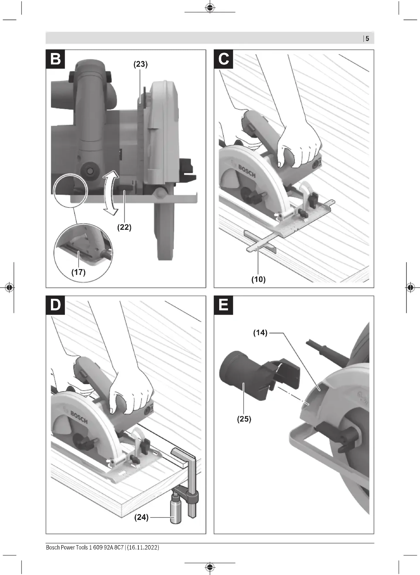 Max. cutting depth with 184mm saw blade diameter – at a 0° mitre/bevel angle mm 64 – at a 45° mitre/bevel angle mm 45 Spindle lock ● Base plate dimensions mm 290 x 150 Max. saw blade diameter mm 184 Min. saw blade diameter mm 184 Max. base blade thickness mm 2.0 Locating bore mm 20 Weight according to EPTA-Procedure01:2014 kg 3.9 Protection class / II The specifications apply to a rated voltage [U] of 230 V. These spe- cifications may vary at different voltages and in country-specific mod- els. Fitting u Only use saw blades the maximum permitted speed of which is higher than the no-load speed of the power tool. Inserting/changing the circular saw blade u Pull the plug out of the socket before carrying out any work on the power tool. u Wear protective gloves when fitting the saw blade. Danger of injury when touching the saw blade. u Do not use abrasive wheels as the application tool un- der any circumstances. Removing the saw blade (see figure A) To change tools, we recommend that you place the power tool down on the front side of the motor housing. – Press and hold the spindle lock button (4). u Do not press the spindle lock button (4) while the saw spindle is moving. The power tool may become damaged if this happens. – Use the hex key (17) to undo the clamping bolt (18) in ro- tational direction ➊. – Swing the retracting blade guard (11) back and hold on to it firmly. – Remove the clamping flange (19) and the saw blade (20) from the saw spindle with mounting flange (21). Selecting the saw blade You will find an overview of recommended saw blades at the end of these operating instructions. Fitting the Saw Blade (see figure A) To change tools, we recommend that you place the power tool down on the front side of the motor housing. – Clean the saw blade (20) and all the clamping elements to be fitted. – Swing the retracting blade guard (11) back and hold on to it firmly. – Place the saw blade (20) on the saw spindle with mount- ing flange (21). The cutting direction of the teeth (direc- tion of the arrow on the saw blade) must match the rota- tional direction of the arrow on the protective guard (15). – Attach the clamping flange (19) and screw in the clamp- ing bolt (18) in rotational direction ➋. Ensure that the saw spindle with mounting flange (21) and clamping flange (19) are installed in the correct position. – Press and hold the spindle lock button (4). – Use the hex key (17) to tighten the clamping bolt (18) in rotational direction ➋. The tightening torque should be 6–9Nm, which corresponds to hand-tight plus ¼ turn. Dust/chip extraction The dust from materials such as lead paint, some types of wood, minerals and metal can be harmful to human health. Touching or breathing in this dust can trigger allergic reac- tions and/or cause respiratory illnesses in the user or in people in the near vicinity. Certain dusts, such as oak or beech dust, are classified as carcinogenic, especially in conjunction with wood treatment additives (chromate, wood preservative). Materials contain- ing asbestos may only be machined by specialists. – Use a dust extraction system that is suitable for the ma- terial wherever possible. – Provide good ventilation at the workplace. – It is advisable to wear a P2 filter class breathing mask. The regulations on the material being machined that apply in the country of use must be observed. u Avoid dust accumulation at the workplace. Dust can easily ignite. Fitting the dust extraction adapter (see figure E) Push the dust extraction adapter (25) onto the chip ejector (14) until it clicks into place. A dust extraction hose with a diameter of 35mm can be con- nected to the dust extraction adapter (25). u The dust extraction adapter must only be fitted if an external dust extraction system is connected. Other- wise the extraction duct can become clogged. u No dust bags should be connected to the dust extrac- tion adapter. Otherwise the extraction system can be- come clogged. Bosch Power Tools 1 609 92A 8C7 | (16.11.2022)10 | English To ensure optimum extraction, the dust extraction adapter (25) must be cleaned regularly. External dust extraction Connect the dust extraction hose to a dust extractor (access- ory). You will find an overview of connecting to various dust extractors at the end of these operating instructions. The power tool can be directly connected to the socket of a Bosch all-purpose dust extractor with remote starter. This dust extractor is started up automatically when the power tool is switched on. The dust extractor must be suitable for the material being worked. When extracting dry dust that is especially detrimental to health or carcinogenic, use a special dust extractor. Operation u Pull the plug out of the socket before carrying out any work on the power tool. Operating modes Setting the Cutting Depth (see figure B) u Adapt the cutting depth to the thickness of the work- piece. A space of less than the height of one full tooth should be visible under the workpiece. Loosen the clamping lever (22). For a smaller cutting depth, pull the saw away from the base plate (12); for a larger cut- ting depth, push the saw towards the base plate (12). Adjust the desired cutting depth at the cutting-depth scale. Retighten the clamping lever (22). If you are unable to fully adjust the cutting depth after loosening the clamping lever (22), pull the clamping lever (22) away from the saw and swivel it downwards. Loosen the clamping lever (22) again. Repeat this process until the required cutting depth can be set. If you are unable to adequately fix the cutting depth after tightening the clamping lever (22), pull the clamping lever (22) away from the saw and swivel it upwards. Loosen the clamping lever (22) again. Repeat this process until the cut- ting depth is fixed. Adjusting the Mitre/Bevel Angle We recommend that you place the power tool down on the front side of the protective guard (15). Loosen the wing bolt (6). Swivel