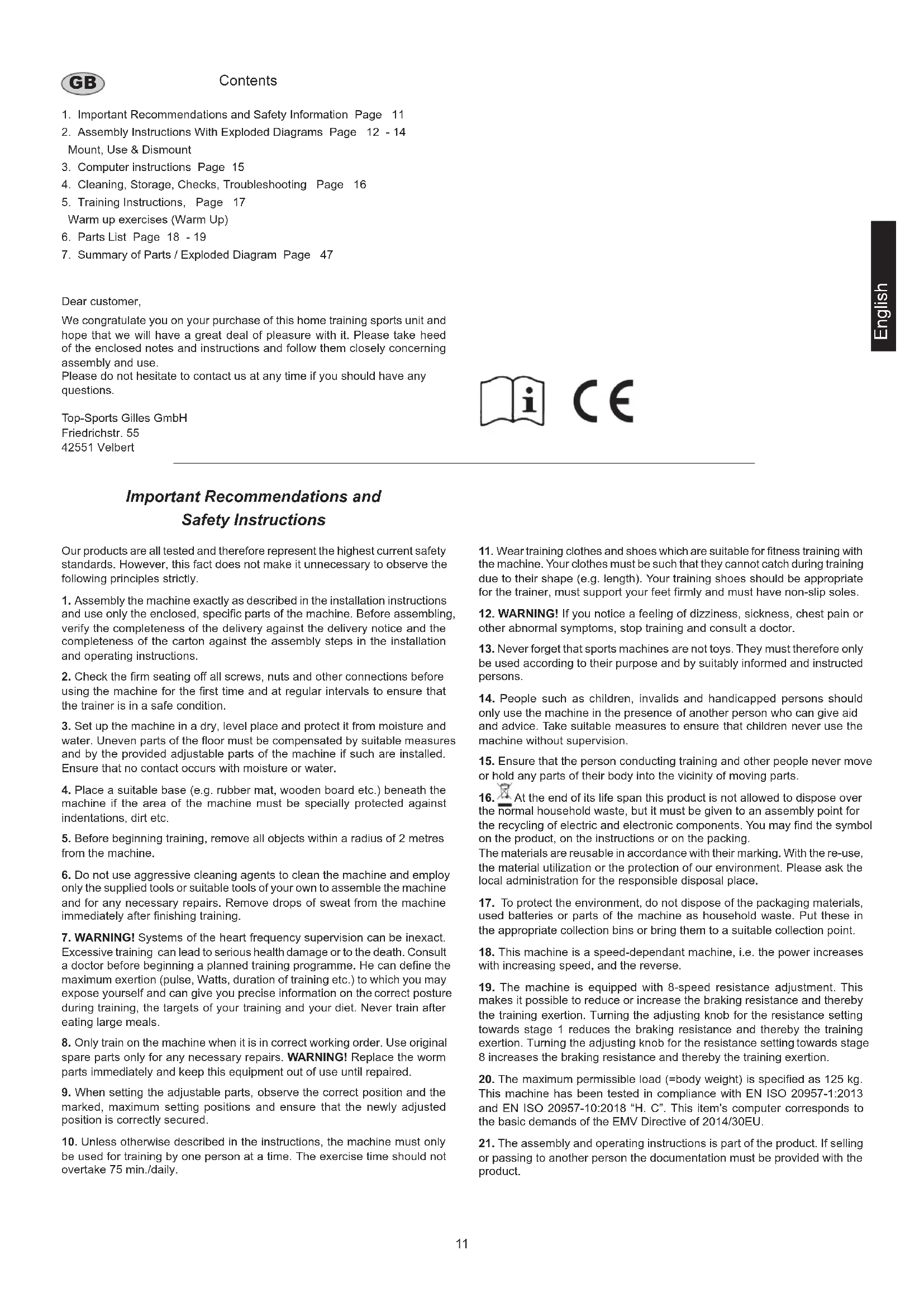 This machine has been tested in compliance with EN ISO 20957-1:2013 and EN ISO 20957-10:2018 “H. C”. This item’s computer corresponds to the basic demands of the EMV Directive of 2014/30EU.21. The assembly and operating instructions is part of the product. If selling or passing to another person the documentation must be provided with the product.Dear customer,We congratulate you on your purchase of this home training sports unit and hope that we will have a great deal of pleasure with it. Please take heed of the enclosed notes and instructions and follow them closely concerning assembly and use.Please do not hesitate to contact us at any time if you should have any questions. Top-Sports Gilles GmbHFriedrichstr. 55 42551 Velbert English12 Assembly Instructions Remove all the separate parts from the packaging, lay them on the oor and check roughly that all are there on the base of the assembly steps. Please note that a number of parts are connected directly to the main frame preassembled. In addition, there are several other individual parts that have been attached to separate units. This will makes assembly easier and quicker for you. Assembly time: 30 min. Step 1: Attach the stabilizer (4+15) at main frame (16).