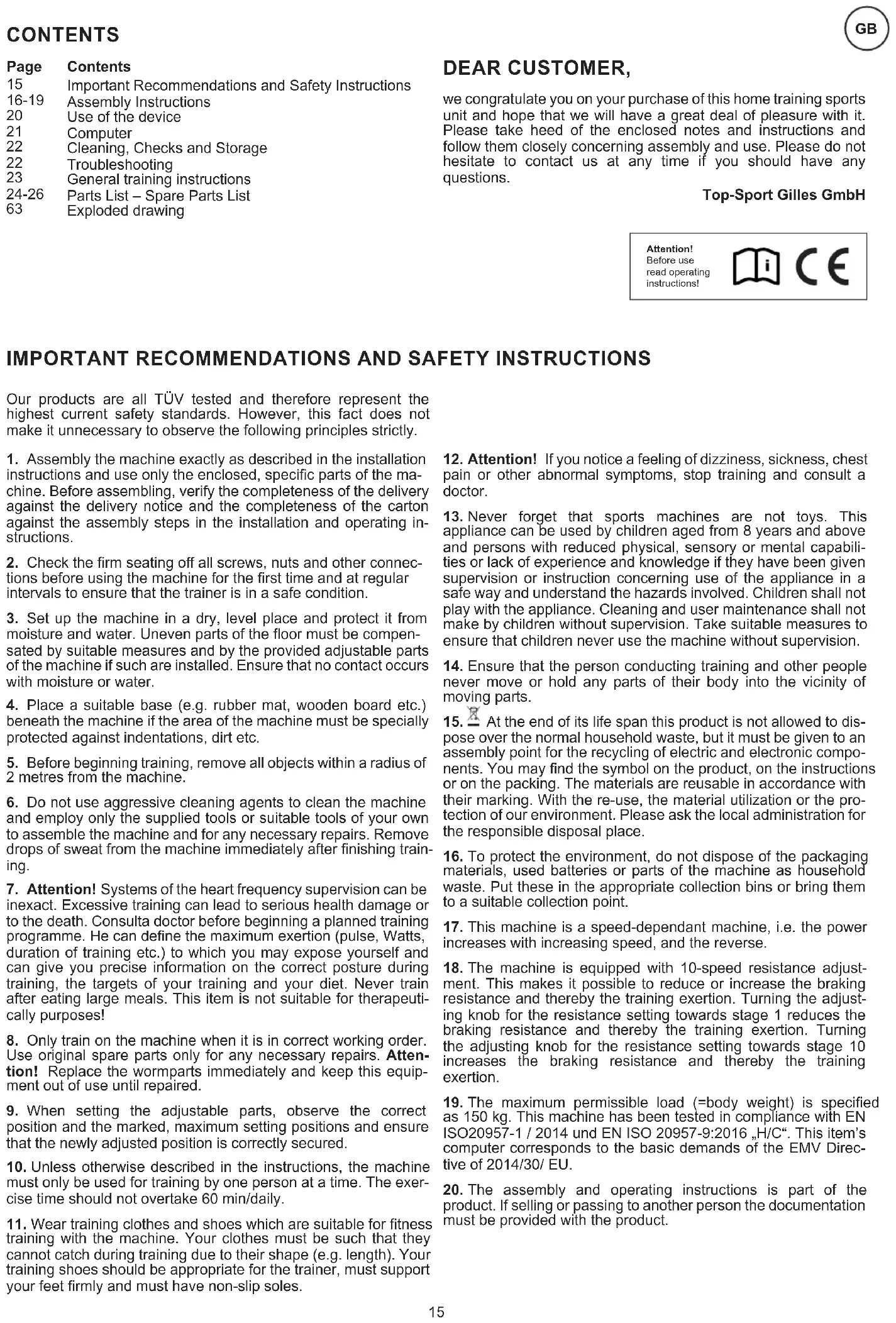 product. If selling or passing to another person the documentation must be provided with the product. CONTENTS DEAR CUSTOMER, we congratulate you on your purchase of this home training sports unit and hope that we will have a great deal of pleasure with it. Please take heed of the enclosed notes and instructions and follow them closely concerning assembly and use. Please do not hesitate to contact us at any time if you should have any questions. Top-Sport Gilles GmbH ContentsPage Attention! Before use read operating instructions!