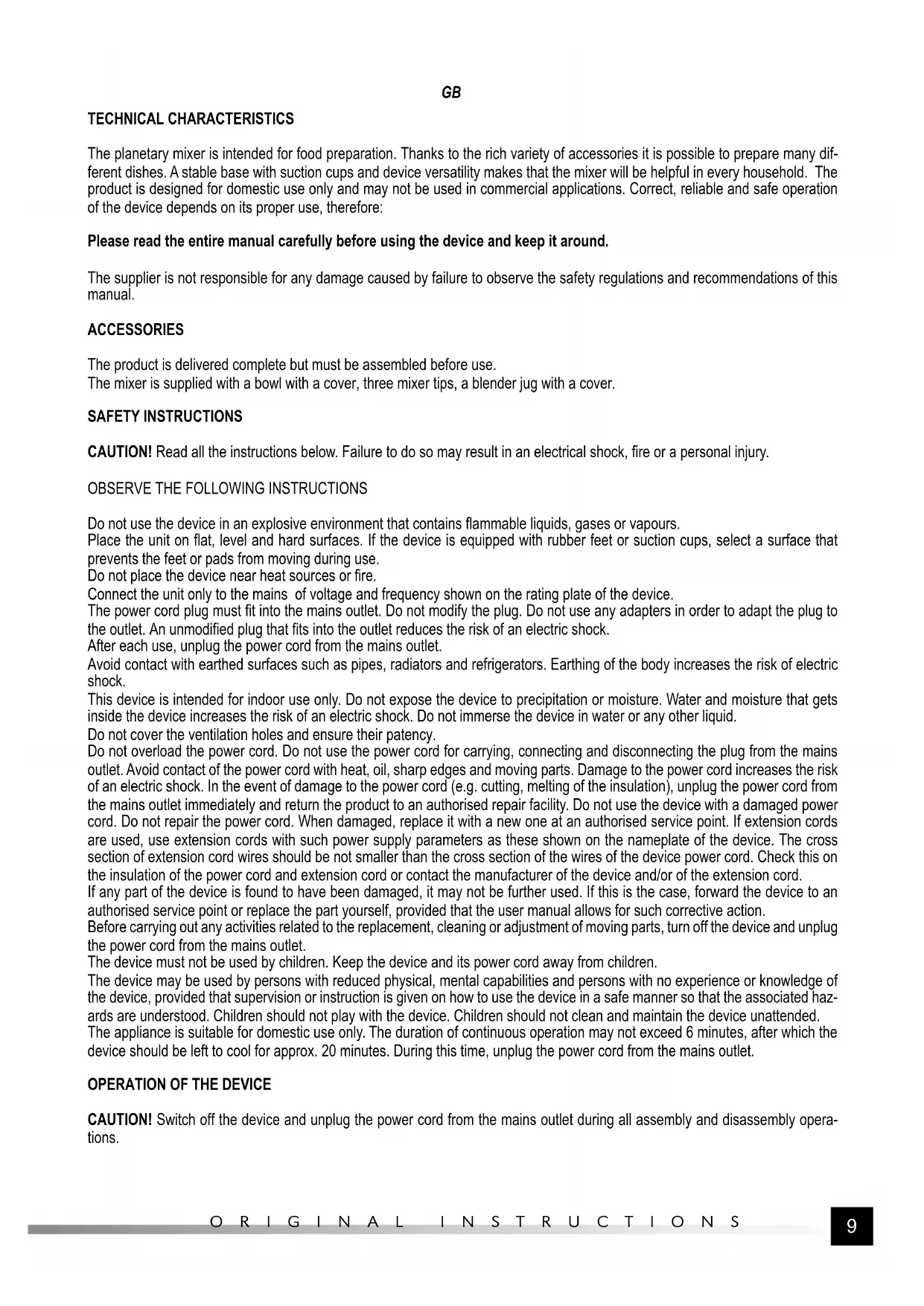 ORIGINAL INSTRUCTIONS TECHNICAL CHARACTERISTICS The planetary mixer is intended for food preparation. Thanks to the rich variety of accessories it is possible to prepare many dif- ferent dishes. A stable base with suction cups and device versatility makes that the mixer will be helpful in every household. The product is designed for domestic use only and may not be used in commercial applications. Correct, reliable and safe operation of the device depends on its proper use, therefore: Please read the entire manual carefully before using the device and keep it around. The supplier is not responsible for any damage caused by failure to observe the safety regulations and recommendations of this manual. ACCESSORIES The product is delivered complete but must be assembled before use. The mixer is supplied with a bowl with a cover, three mixer tips, a blender jug with a cover. SAFETY INSTRUCTIONS CAUTION! Read all the instructions below. Failure to do so may result in an electrical shock, fire or a personal injury.