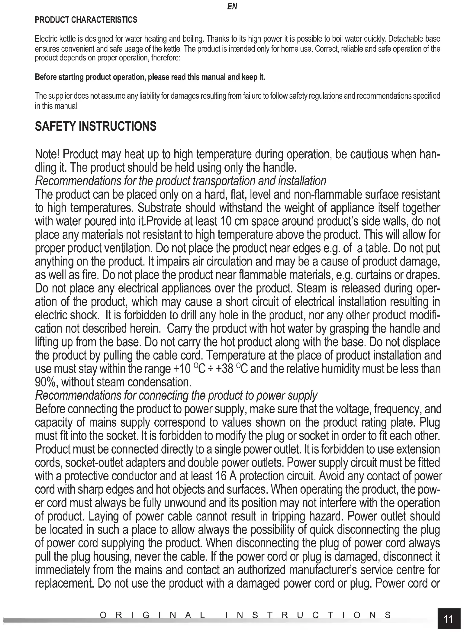 ORIGINAL INSTRUCTIONS PRODUCT CHARACTERISTICS Electric kettle is designed for water heating and boiling. Thanks to its high power it is possible to boil water quickly. Detachable base ensures convenient and safe usage of the kettle. The product is intended only for home use. Correct, reliable and safe operation of the product depends on proper operation, therefore: Before starting product operation, please read this manual and keep it. The supplier does not assume any liability for damages resulting from failure to follow safety regulations and recommendations specifi ed in this manual. SAFETY INSTRUCTIONS Note! Product may heat up to high temperature during operation, be cautious when han- dling it. The product should be held using only the handle. Recommendations for the product transportation and installation The product can be placed only on a hard, fl at, level and non-fl ammable surface resistant to high temperatures. Substrate should withstand the weight of appliance itself together with water poured into it.Provide at least 10 cm space around product’s side walls, do not place any materials not resistant to high temperature above the product. This will allow for proper product ventilation. Do not place the product near edges e.g. of a table. Do not put anything on the product. It impairs air circulation and may be a cause of product damage, as well as fi re. Do not place the product near fl ammable materials, e.g. curtains or drapes. Do not place any electrical appliances over the product. Steam is released during oper- ation of the product, which may cause a short circuit of electrical installation resulting in electric shock. It is forbidden to drill any hole in the product, nor any other product modifi - cation not described herein. Carry the product with hot water by grasping the handle and lifting up from the base. Do not carry the hot product along with the base. Do not displace the product by pulling the cable cord. Temperature at the place of product installation and use must stay within the range +10