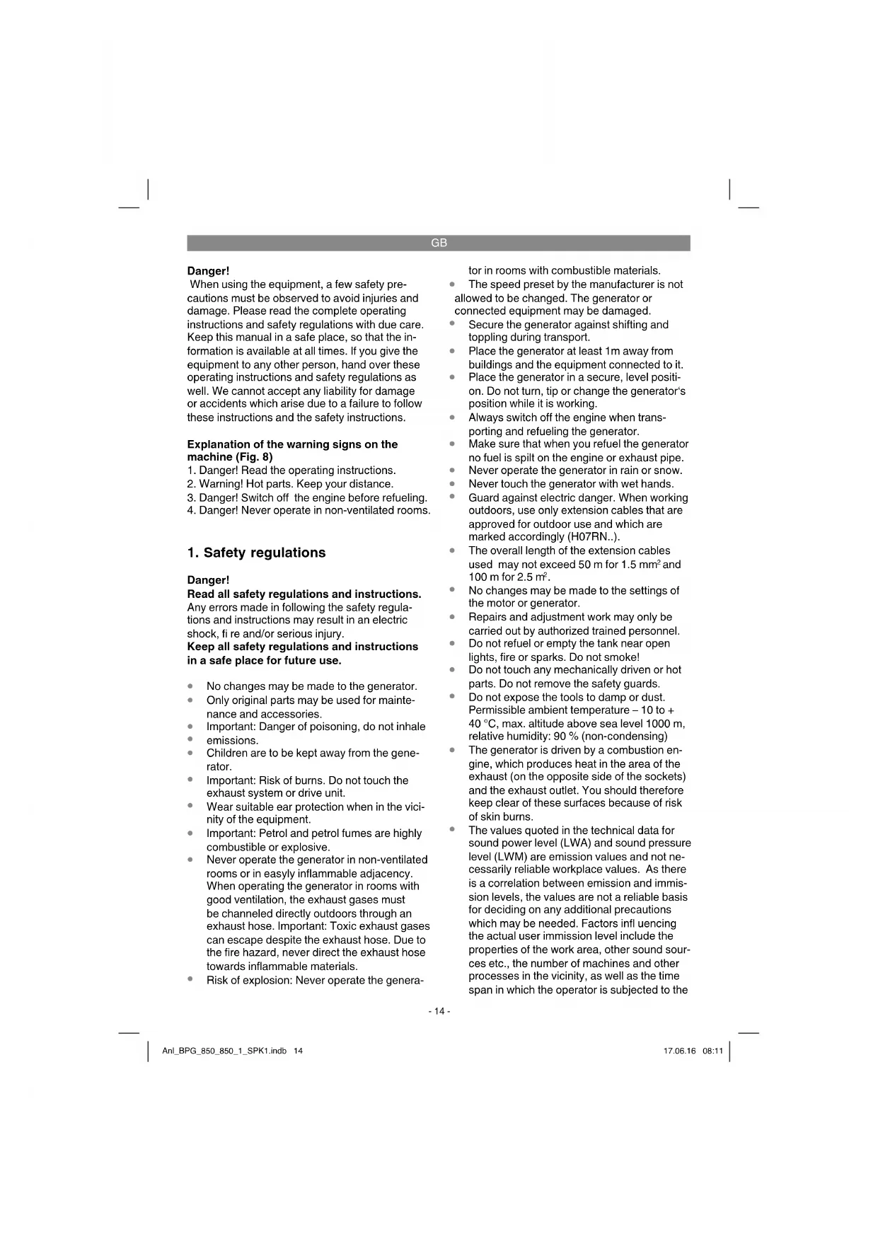 The values quoted in the technical data for sound power level (LWA) and sound pressure level (LWM) are emission values and not ne- cessarily reliable workplace values. As there is a correlation between emission and immis- sion levels, the values are not a reliable basis for deciding on any additional precautions which may be needed. Factors infl uencing the actual user immission level include the properties of the work area, other sound sour- ces etc., the number of machines and other processes in the vicinity, as well as the time span in which the operator is subjected to the Anl_BPG_850_850_1_SPK1.indb 14Anl_BPG_850_850_1_SPK1.indb 14 17.06.16 08:1117.06.16 08:11GB
