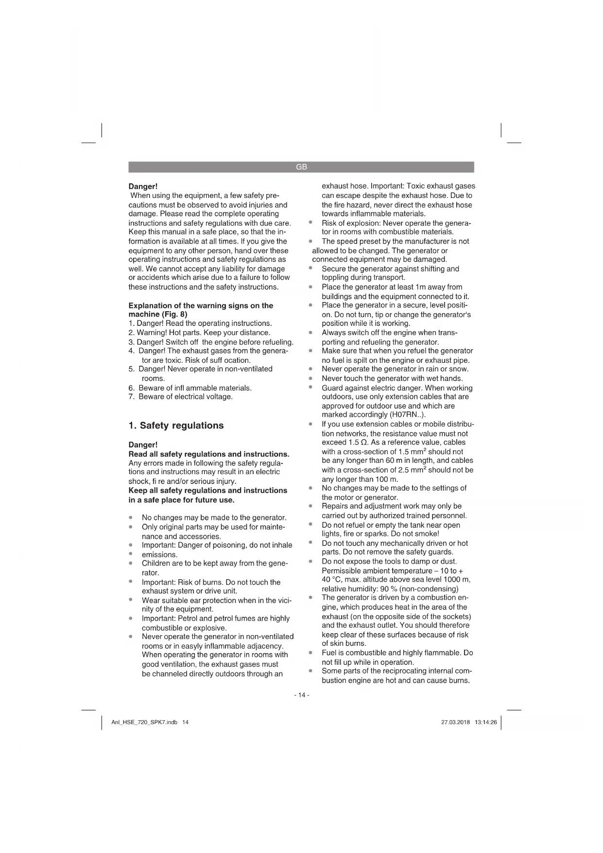 Fault Possible cause Remedy Engine does not start Automatic oil cut-out has not responded No fuel Check the oil level, top up with engine oil Refuel Generator has too little or no voltage Controller or capacitor defective Overcurrent circuit-breaker has triggered Air fi lter dirty Contact your dealer Actuate the circuit-breaker and reduce the consumers Clean or replace the fi lter Anl_HSE_720_SPK7.indb 19Anl_HSE_720_SPK7.indb 19 27.03.2018 13:14:2627.03.2018 13:14:26GB