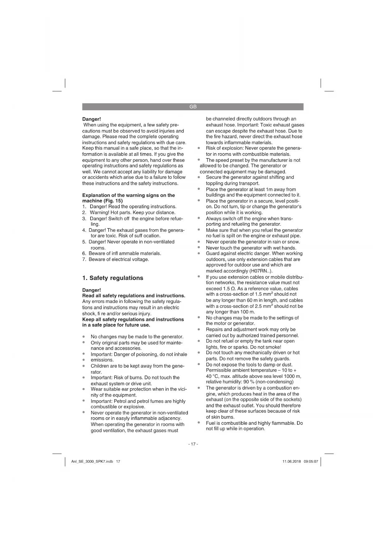 Do not connect the generator to the domestic power network as this may result in damage to the generator itself or to other electrical appliances in your home. Note: Some electrical appliances (power jigsaws, drills, etc.) may have a higher level of power con- sumption when used in diffi cult conditions. Anl_SE_3000_SPK7.indb 20Anl_SE_3000_SPK7.indb 20 11.06.2018 09:05:0711.06.2018 09:05:07GB