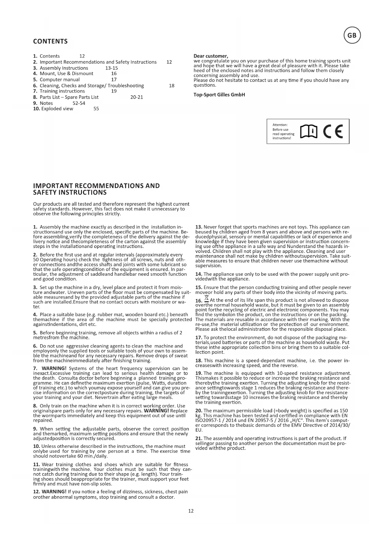 SAFETY INSTRUCTIONS Dear customer, we congratulate you on your purchase of this home training sports unit and hope that we will have a great deal of pleasure with it. Please take heed of the enclosed notes and instrucons and follow them closely concerning assembly and use. Please do not hesitate to contact us at any me if you should have any quesons. Top-Sport Gilles GmbH Our products are all tested and therefore represent the highest current safety standards. However, this fact does not make it unnecessary to observe the following principles strictly.