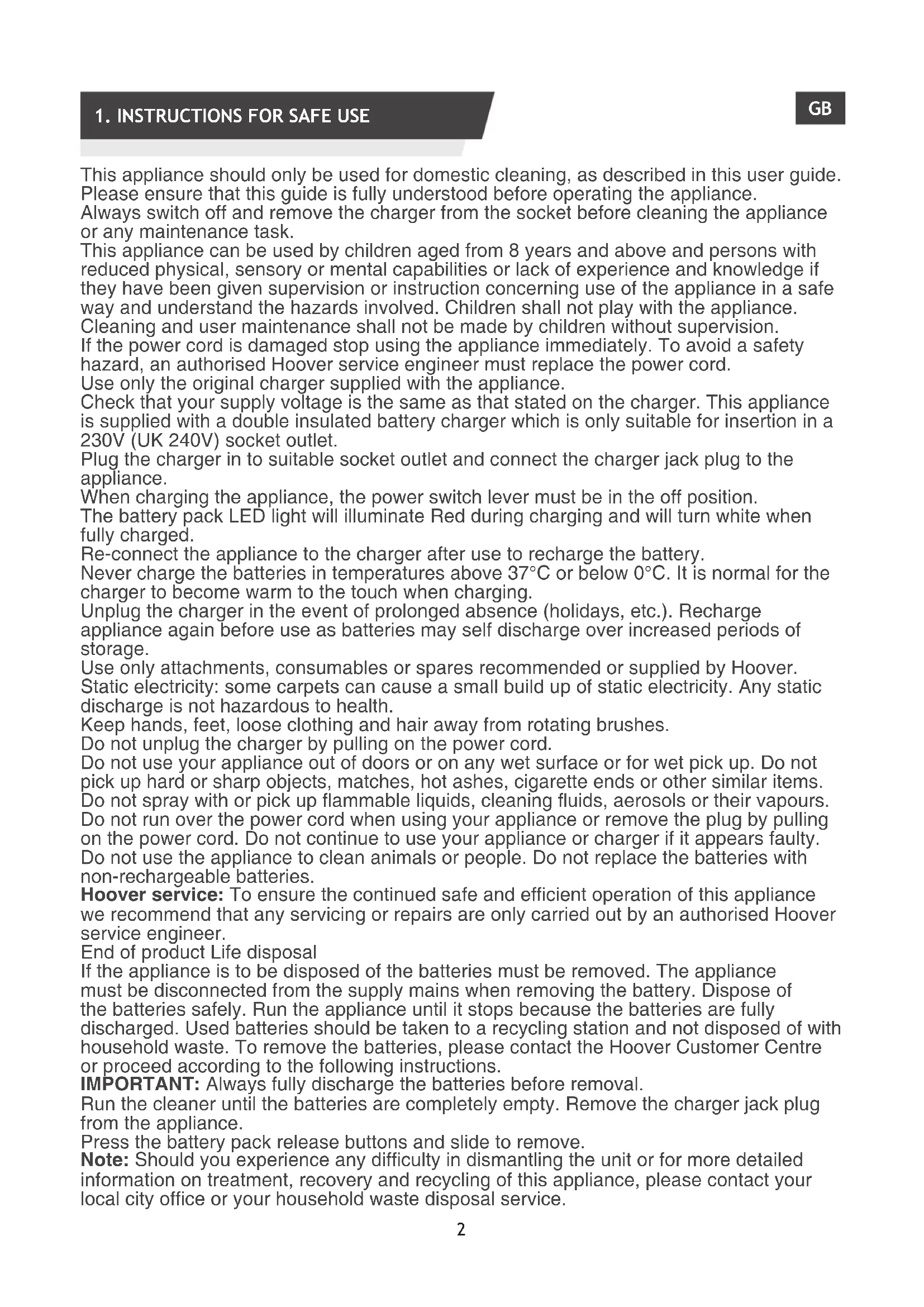 This appliance should only be used for domestic cleaning, as described in this user guide. Please ensure that this guide is fully understood before operating the appliance. Always switch off and remove the charger from the socket before cleaning the appliance or any maintenance task. This appliance can be used by children aged from 8 years and above and persons with reduced physical, sensory or mental capabilities or lack of experience and knowledge if they have been given supervision or instruction concerning use of the appliance in a safe way and understand the hazards involved. Children shall not play with the appliance. Cleaning and user maintenance shall not be made by children without supervision. If the power cord is damaged stop using the appliance immediately. To avoid a safety hazard, an authorised Hoover service engineer must replace the power cord. Use only the original charger supplied with the appliance. Check that your supply voltage is the same as that stated on the charger. This appliance is supplied with a double insulated battery charger which is only suitable for insertion in a 230V (UK 240V) socket outlet. Plug the charger in to suitable socket outlet and connect the charger jack plug to the appliance. When charging the appliance, the power switch lever must be in the off position. The battery pack LED light will illuminate Red during charging and will turn white when fully charged. Re-connect the appliance to the charger after use to recharge the battery. Never charge the batteries in temperatures above 37°C or below 0°C. It is normal for the charger to become warm to the touch when charging. Unplug the charger in the event of prolonged absence (holidays, etc.). Recharge appliance again before use as batteries may self discharge over increased periods of storage. Use only attachments, consumables or spares recommended or supplied by Hoover. Static electricity: some carpets can cause a small build up of static electricity. Any static discharge is not hazardous to health. Keep hands, feet, loose clothing and hair away from rotating brushes. Do not unplug the charger by pulling on the power cord. Do not use your appliance out of doors or on any wet surface or for wet pick up. Do not pick up hard or sharp objects, matches, hot ashes, cigarette ends or other similar items. Do not spray with or pick up ammable liquids, cleaning uids, aerosols or their vapours. Do not run over the power cord when using your appliance or remove the plug by pulling on the power cord. Do not continue to use your appliance or charger if it appears faulty. Do not use the appliance to clean animals or people. Do not replace the batteries with non-rechargeable batteries. Hoover service: To ensure the continued safe and efcient operation of this appliance we recommend that any servicing or repairs are only carried out by an authorised Hoover service engineer. End of product Life disposal If the appliance is to be disposed of the batteries must be removed. The appliance must be disconnected from the supply mains when removing the battery. Dispose of the batteries safely. Run the appliance until it stops because the batteries are fully discharged. Used batteries should be taken to a recycling station and not disposed of with household waste. To remove the batteries, please contact the Hoover Customer Centre or proceed according to the following instructions. IMPORTANT: Always fully discharge the batteries before removal. Run the cleaner until the batteries are completely empty. Remove the charger jack plug from the appliance. Press the battery pack release buttons and slide to remove. Note: Should you experience any difculty in dismantling the unit or for more detailed information on treatment, recovery and recycling of this appliance, please contact your local city ofce or your household waste disposal service. GB3 The Environment The symbol on this appliance indicates that this appliance may not be treated as household waste. Instead it must be handed over to the applicable collection point for the recycling of electrical and electronic equipment. Disposal must be carried out in accordance with local environmental regulations for waste disposal. For more detailed information about treatment, recovery and recycling of this appliance, please contact your local city oce, your household and waste disposal service or the shop where you purchased the appliance.