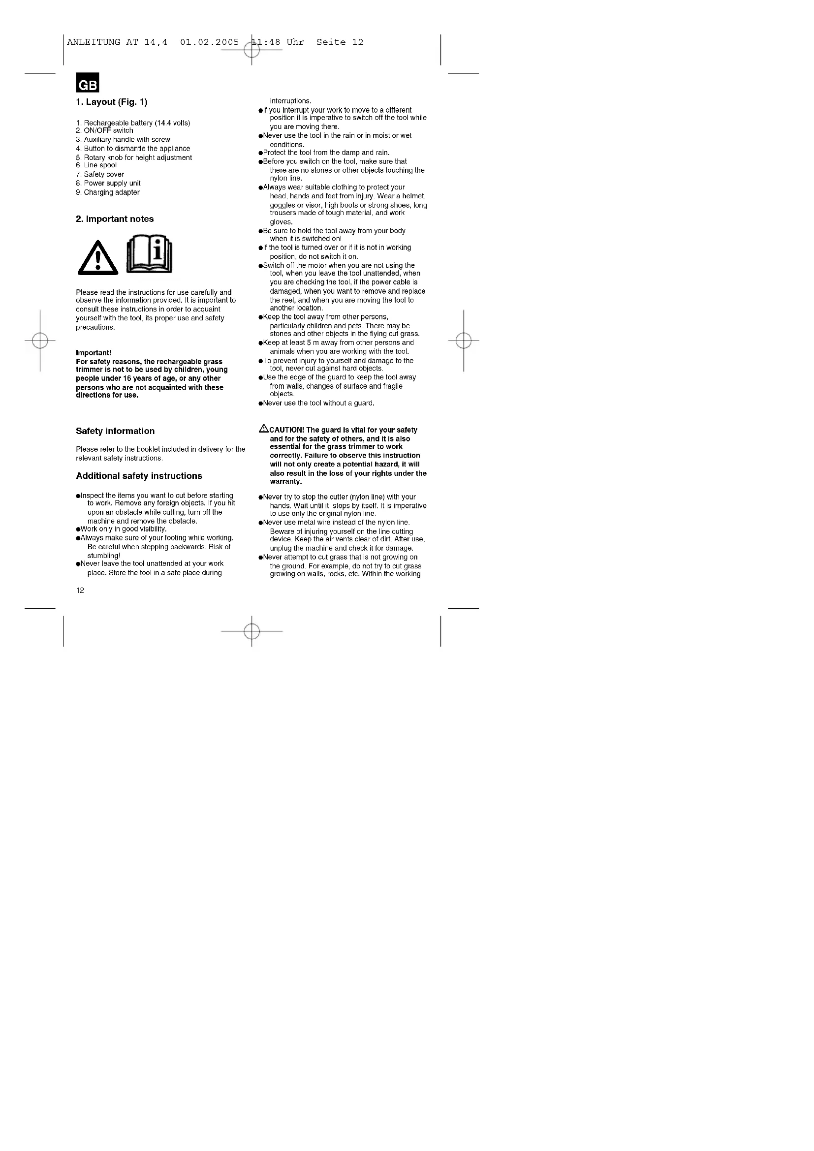 ANLEITUNG AT 14,4 01.02.2005 11:48 Uhr Seite 12radius of the grass trimmer the user is responsible for any damage caused to third persons by use of the trimmer. Never cross roads or pebble paths with the grass trimmer switched on. When you are not using the grass trimmer, keep it in a dry place out of the reach of children. Use the grass trimmer only as described in these directions for use and always hold it vertical to the ground. All other positions are dangerous. Check the screws regularly to see that they are properly tightened. Keep cables and other objects out of the area you want to cut. If you have to lift the grass trimmer to move it, switch off the motor and wait for the rotating tool to stop. Before you connect the grass trimmer to the power supply, make sure that none of its moving parts are damaged and that the line spool is correctly inserted and fastened. Never cut against hard objects when using the grass trimmer. This is imperative to avoid causing injury to the user and damage to the trimmer. Use only original replacement parts for repair and maintenance purposes. Examine the grass trimmer for signs of wear or damage each time before you use it and after any collisions. Have essential repairs carried out without delay. Always keep your hands and feet away from the cutting mechanism, particularly when you switch on the trimmer. After pulling out new line, always return the trimmer to normal working position before you switch it on again. Never use replacement parts or accessories which are not foreseen or recommended by the manufacturer. Unplug the rechargeable battery before checking, cleaning or doing any work on the machine and when it is not being used. Caution! The nylon line will run on for a few seconds after the tool is switched off!