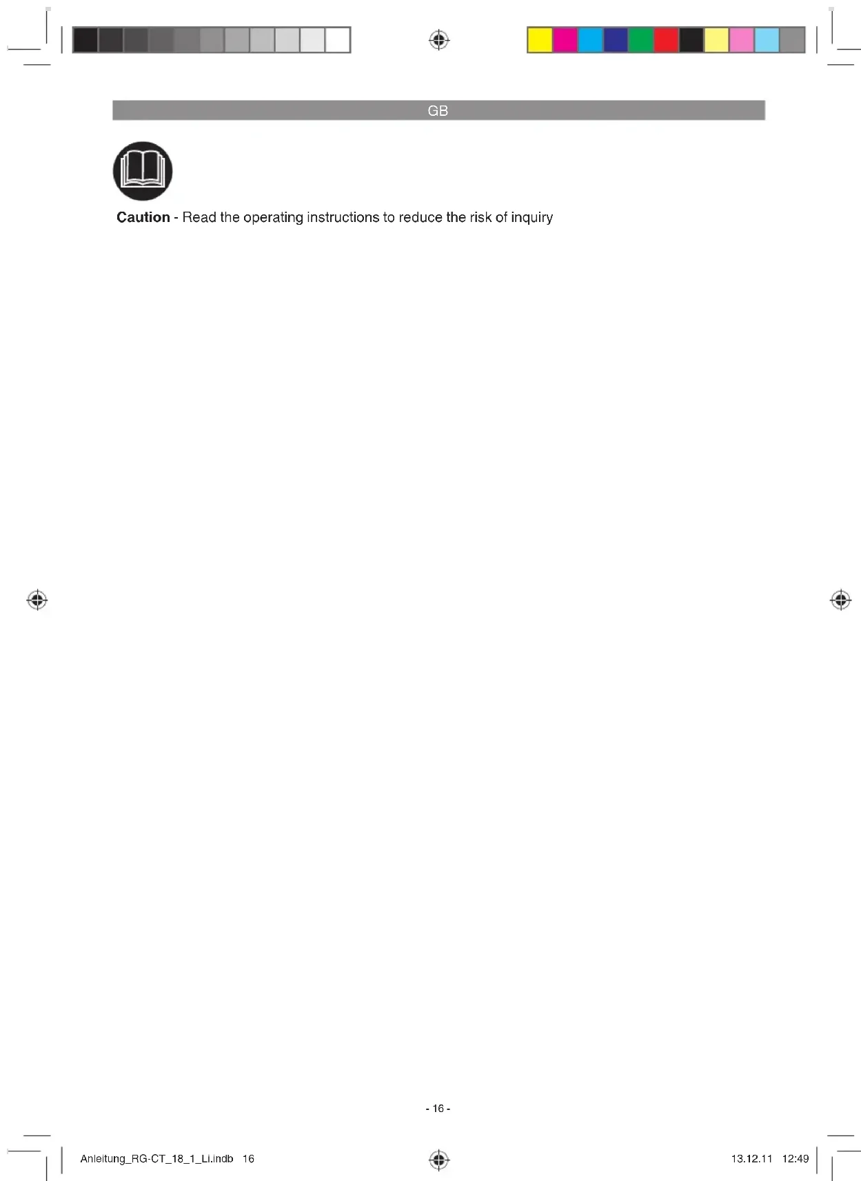 address shown below. Please enclose either the original or a copy of your sales receipt or ano- ther dated proof of purchase. Please keep your sales receipt in a safe place, as it is your proof of purchase. It would help us if you could describe the nature of the problem in as much detail as pos- sible. If the defect is covered by our guarantee then your device will either be repaired immediately and returned to you, or we will send you a new device. Of course, we are also happy off er a chargeable repair service for any defects which are not covered by the scope of this guarantee or for units which are no longer covered. To take advantage of this service, please send the device to our service address. Anleitung_RG-CT_18_1_Li.indb 22Anleitung_RG-CT_18_1_Li.indb 22 13.12.11 12:5013.12.11 12:50F