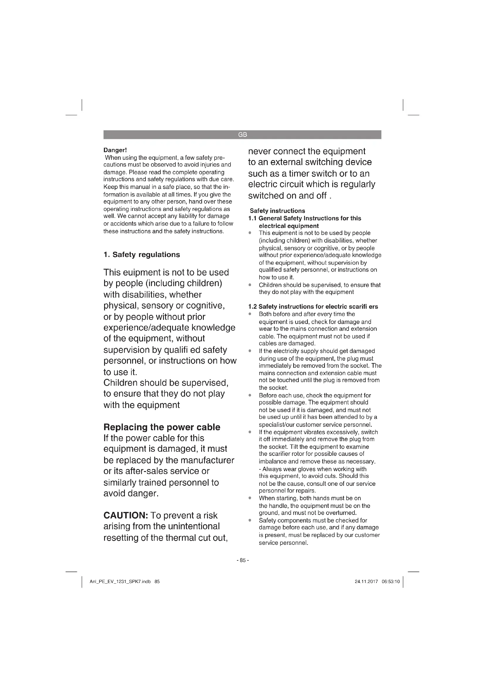 The equipment is intended for private use i.e. for use in home and gardening environments. Scarifi ers for private use are machines whose an- nual operating time generally does not exceed 10 hours, during which the machine is primarily used to maintain small-scale, residential lawns and home/hobby gardens. Public facilities, sporting halls, and agricultural/forestry applications are excluded. The operating instructions as supplied by the ma- nufacturer must be kept and referred to in order to ensure that the equipment is properly used and maintained. The instructions contain valuable information on operating, maintenance and servi- cing conditions. Warning! Due to the high risk of bodily injury to the user, the equipment may not be used to grind up branch or hedge clippings. Moreover, the equipment may not be used as a power cultivator to level out high areas such as mole hills. Anl_PE_EV_1231_SPK7.indb 87Anl_PE_EV_1231_SPK7.indb 87 24.11.2017 06:53:1024.11.2017 06:53:10GB