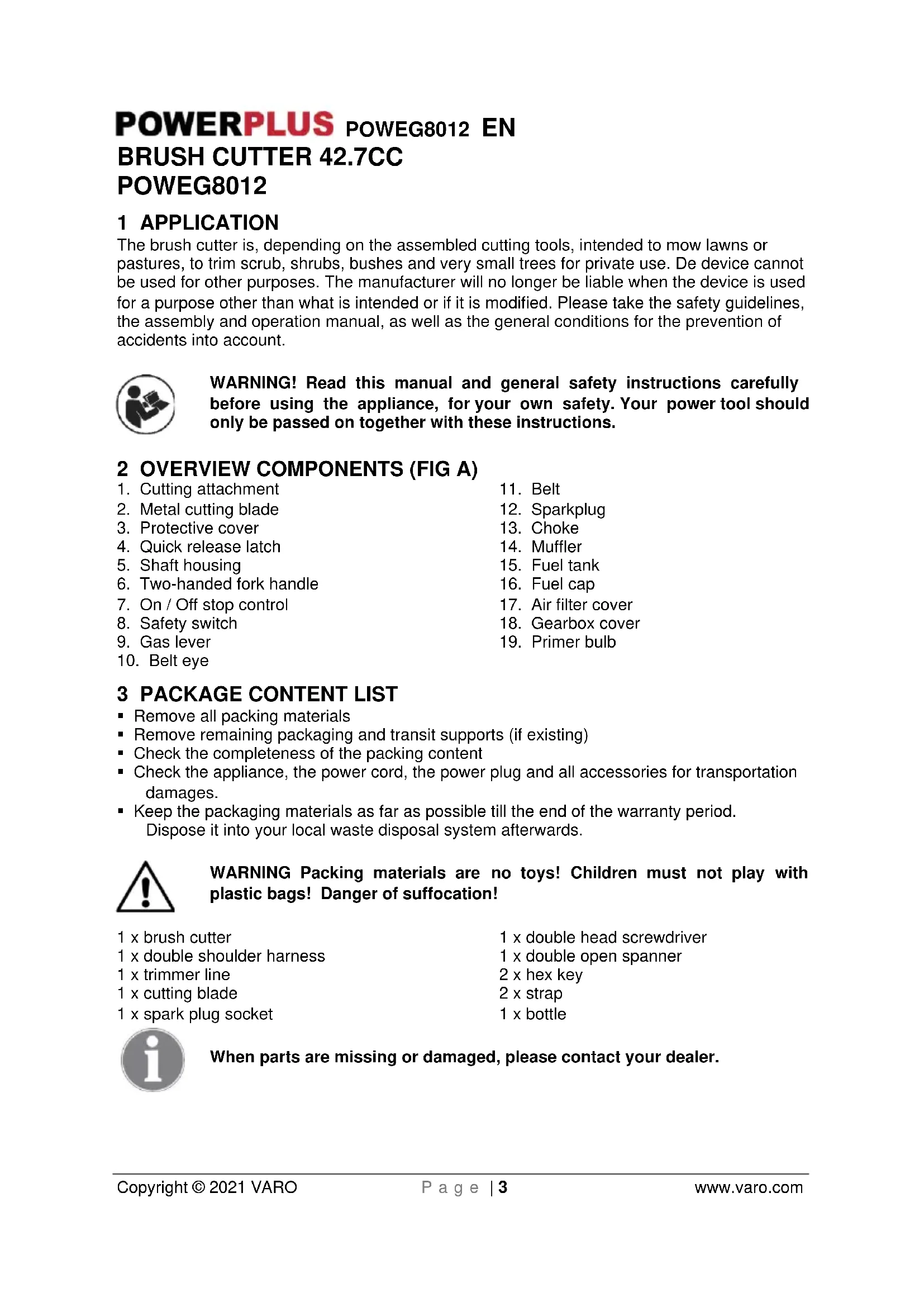 - Keep the packaging materials as far as possible till the end of the warranty period. Dispose it into your local waste disposal system afterwards. WARNING Packing materials are no toys! Children must not play with plastic bags! Danger of suffocation! 1 x brush cutter 1 x double shoulder harness 1 x trimmer line 1 x cutting blade 1 x spark plug socket 1 x double head screwdriver 1 x double open spanner 2 x hex key 2 x strap 1 x bottle When parts are missing or damaged, please contact your dealer.POWEG8012 EN Copyright © 2021 VARO P a g e | 4 www.varo.com 4 SYMBOLS In this manual and/or on the machine the following symbols are used: