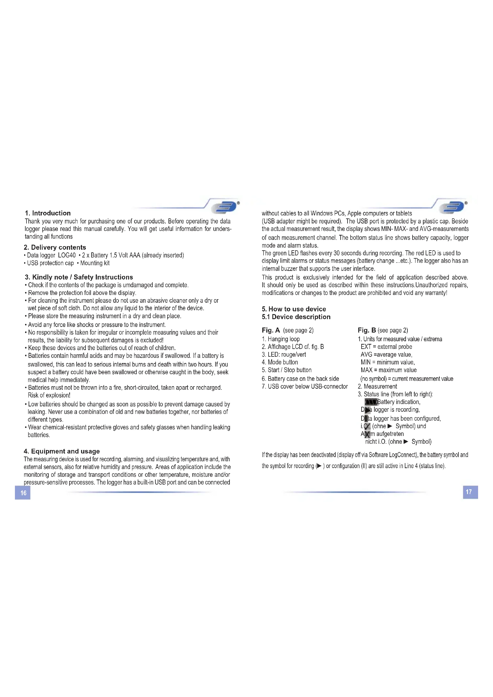 The measuring device is used for recording, alarming, and visualizing temperature and, with external sensors, also for relative humidity and pressure. Areas of application include the monitoring of storage and transport conditions or other temperature, moisture and/or pressure-sensitive processes. The logger has a built-in USB port and can be connected without cables to all Windows PCs, Apple computers or tablets (USB adapter might be required). The USB port is protected by a plastic cap. Beside the actual measurement result, the display shows MIN- MAX- and AVG-measurements of each measurement channel. The bottom status line shows battery capacity, logger mode and alarm status. The green LED ashes every 30 seconds during recording. The red LED is used to display limit alarms or status messages (battery change ...etc.). The logger also has an internal buzzer that supports the user interface. This product is exclusively intended for the eld of application described above. It should only be used as described within these instructions.Unauthorized repairs, modications or changes to the product are prohibited and void any warranty!