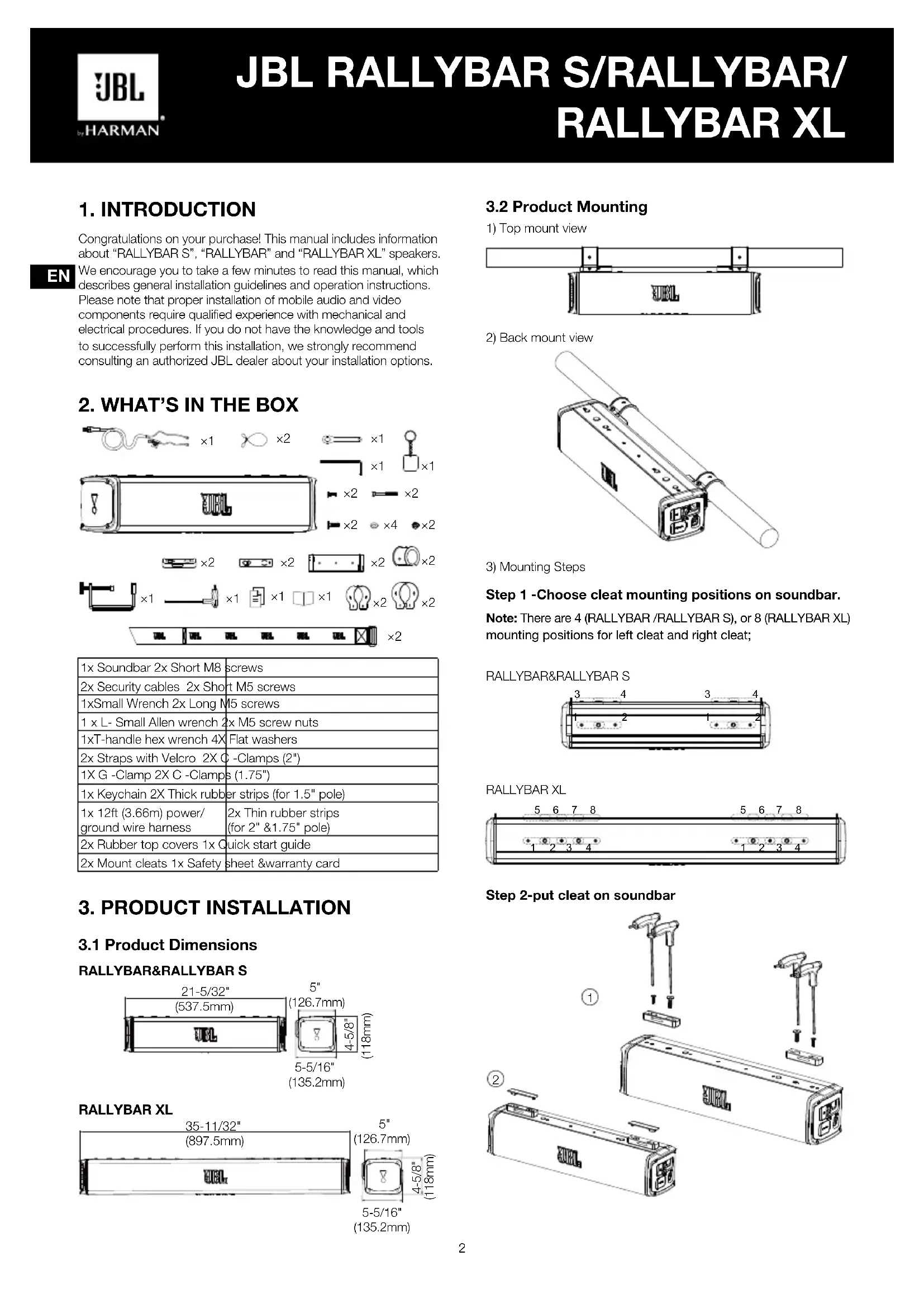 Congratulations on your purchase! This manual includes information about “RALLYBAR S”, “RALLYBAR” and “RALLYBAR XL” speakers. We encourage you to take a few minutes to read this manual, which describes general installation guidelines and operation instructions. Please note that proper installation of mobile audio and video components require qualified experience with mechanical and electrical procedures. If you do not have the knowledge and tools to successfully perform this installation, we strongly recommend consulting an authorized JBL dealer about your installation options.