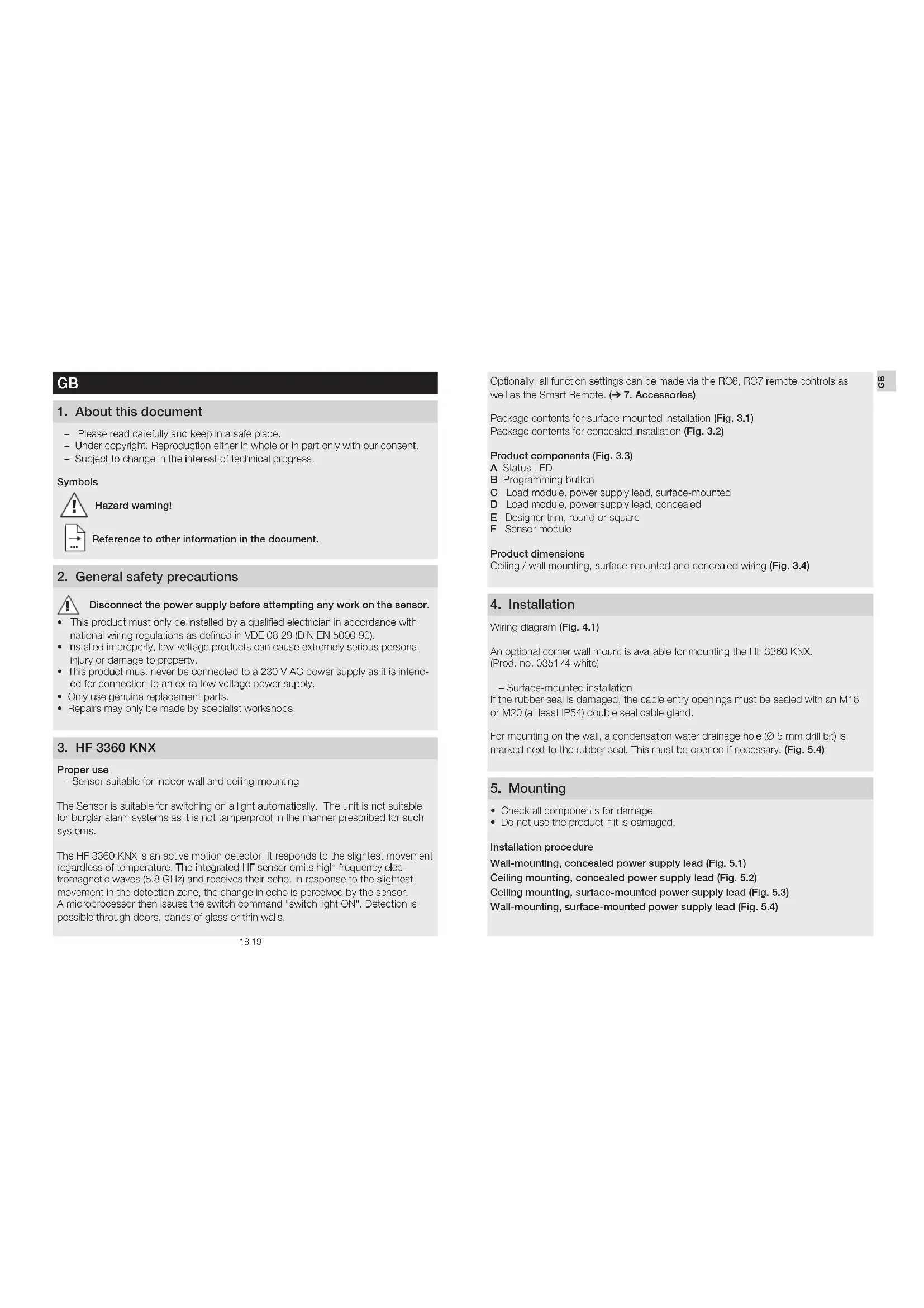 - Repairs may only be made by specialist workshops. 3 HF 3360 KNX Proper use – Sensor suitable for indoor wall and ceiling-mounting The Sensor is suitable for switching on a light automatically. The unit is not suitable for burglar alarm systems as it is not tamperproof in the manner prescribed for such systems. The HF 3360 KNX is an active motion detector. It responds to the slightest movement regardless of temperature. The integrated HF sensor emits high-frequency elec- tromagnetic waves (5.8 GHz) and receives their echo. In response to the slightest movement in the detection zone, the change in echo is perceived by the sensor. A microprocessor then issues the switch command "switch light ON". Detection is possible through doors, panes of glass or thin walls.