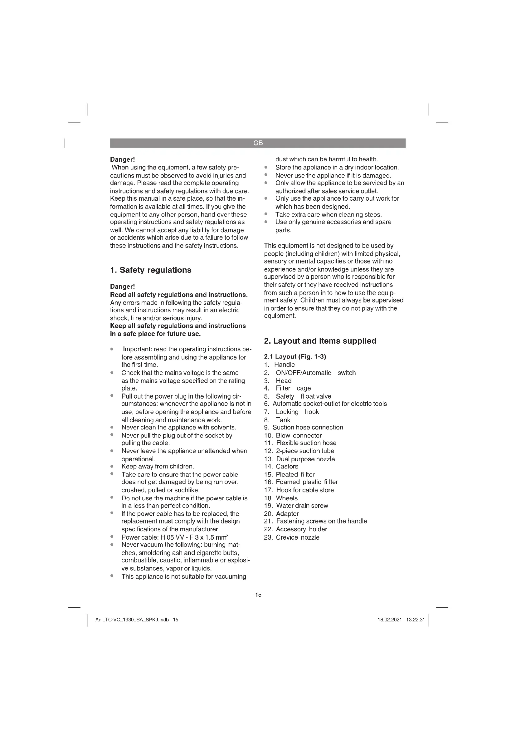 The wet and dry vacuum cleaner is designed for wet and dry vacuuming using the appropri- ate fi lter. The equipment is not suitable for the vacuuming of combustible, explosive or harmful substances. The equipment is to be used only for its prescri- bed purpose. Any other use is deemed to be a case of misuse. The user / operator and not the manufacturer will be liable for any damage or inju- ries of any kind caused as a result of this. Please note that our equipment has not been de- signed for use in commercial, trade or industrial applications. Our warranty will be voided if the machine is used in commercial, trade or industrial businesses or for equivalent purposes.