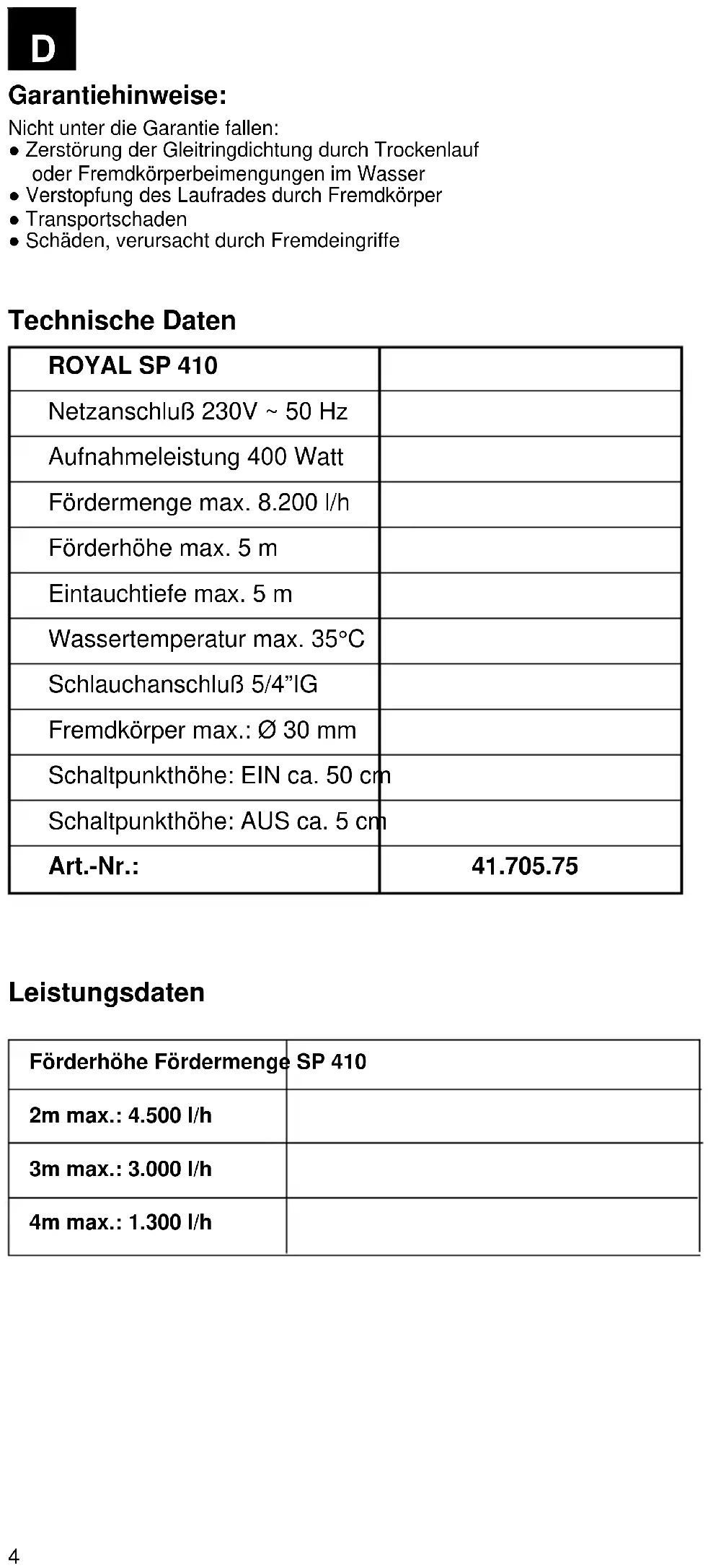 Förderhöhe Fördermenge SP 410 2m max.: 4.500 l/h 3m max.: 3.000 l/h 4m max.: 1.300 l/h5 Before start-up, note the following! ● The pump can be connected to any shock-proof plug which has been installed according to regu- lations. The plug must have a supply voltage of 230 V ~ 50 Hz. Fuse min. 6 Amp. Caution! When the pump is to be used near swimming pools or garden ponds and in their area of pro- tection, it must be equipped with a ground-fault circuit interruptor with a nominal trip current of max. 30 mA (according to VDE 0100, part 702 and 738). The pump must not be operated while people are in the swim- ming pool or in the garden pond! Please contact your electrician! Attention! (Important for your own security) Before starting to run your new submersible pump, please have the following items checked by an expert: ● Ground connection ● Zero conductor ● Fault current breaker switch must correspond the the safety regulations of the power plants and they must work faultessly. ● The electrical connections must be protected from moisture. ● If there is danger of looding, the electrical connections must be taken to higher ground. ● Circulation of aggressiv fluids, as well as the circulation of abra- sive materials must be avoided at all costs. ● The submersible motor-driven pump must be protected from frost. ● The pump must be protected from running dry. Access on the part of children should also be prevented with appropriate measures. Important Note! If the mains cable or plug suffers any damage from external action, repairs to the cable are prohibited. Important! This work may only be performed by a qualified electrician or your ISC GmbH Customer Service. Areas of use This pump is used primarily as cel- lar pump. When installed in a shaft, this pump provides protection from flooding. They are also used wherever water has to be moved from one place to another, e.g. in the home, agricul- ture, horticulture, plumbing and many other applications. Setting to work After having read these instructions carefully, you can set your pump to work, reconsidering the following items: ● Check if the pump rests on the ground of the shaft. ● Check of pressure cord has been attached properly . ● Check if electrical connection is 230 V ~ 50 Hz. ● Check if socket is in good condition. ● Make sure that water and humi- dity can never come to the mains supply. ● Avoid pump running dry. Maintenance guidelines This submersible pump is an approuved, maintenance-free high quality product, which is subject to severe final controls. We recommend, regular inspection and maintenance to ensure long equipment life and uninterrupted operation. Consistency Your submersible pump is designa- ted for the circulation of water with a maximum temperature of 35° C. This pump may not be used for other fluids, especially motor fuels, cleaning fluids, and other chemical products! Installation The submersible motor pumps is installed as follows: ● In a stationary position with fixed pipeline