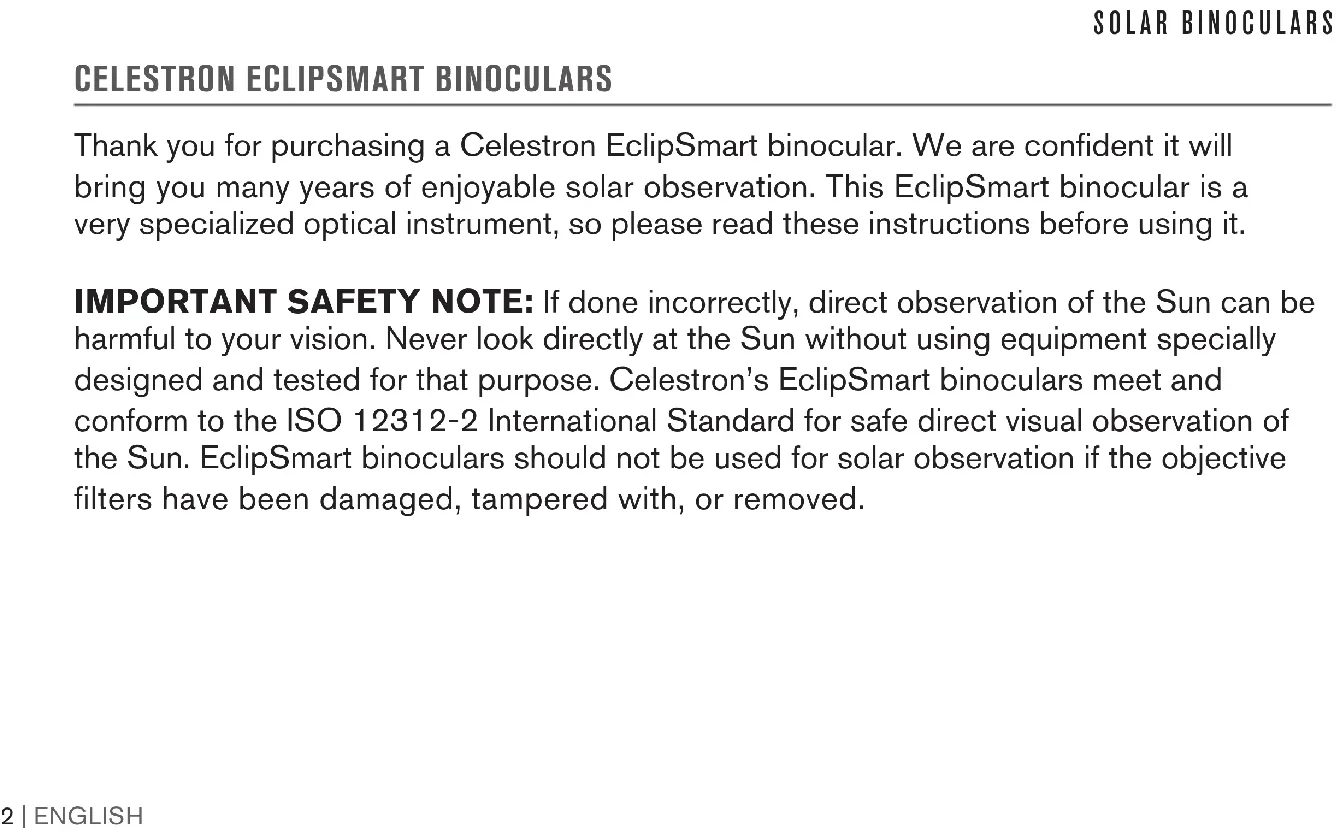 Thank you for purchasing a Celestron EclipSmart binocular. We are confident it will bring you many years of enjoyable solar observation. This EclipSmart binocular is a very specialized optical instrument, so please read these instructions before using it. IMPORTANT SAFETY NOTE: If done incorrectly, direct observation of the Sun can be harmful to your vision. Never look directly at the Sun without using equipment specially designed and tested for that purpose. Celestron’s EclipSmart binoculars meet and conform to the ISO 12312-2 International Standard for safe direct visual observation of the Sun. EclipSmart binoculars should not be used for solar observation if the objective filters have been damaged, tampered with, or removed.3 | ENGLISH SOLAR BINOCULARS SET-UP AND USE OF YOUR CELESTRON ECLIPSMART BINOCULAR Because of its built-in solar filters, you won’t be able to see anything other than the Sun through an EclipSmart binocular. If you do see something other than the Sun through these binoculars, discontinue use immediately and contact Celestron’s customer service department. SET-UP
