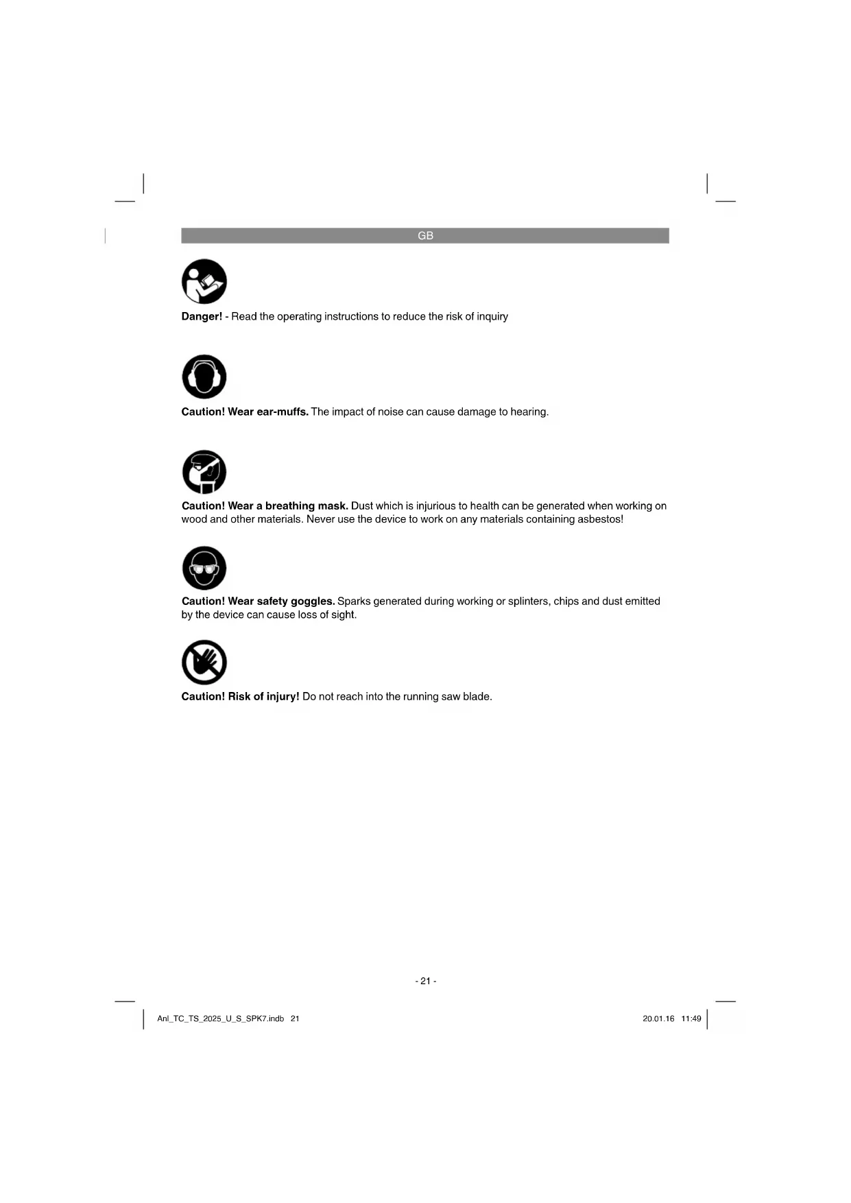 Danger! - Read the operating instructions to reduce the risk of inquiry Caution! Wear ear-muff s. The impact of noise can cause damage to hearing. Caution! Wear safety goggles. Sparks generated during working or splinters, chips and dust emitted by the device can cause loss of sight. Caution! Wear a breathing mask. Dust which is injurious to health can be generated when working on wood and other materials. Never use the device to work on any materials containing asbestos! Caution! Risk of injury! Do not reach into the running saw blade. Anl_TC_TS_2025_U_S_SPK7.indb 21Anl_TC_TS_2025_U_S_SPK7.indb 21 20.01.16 11:4920.01.16 11:49GB