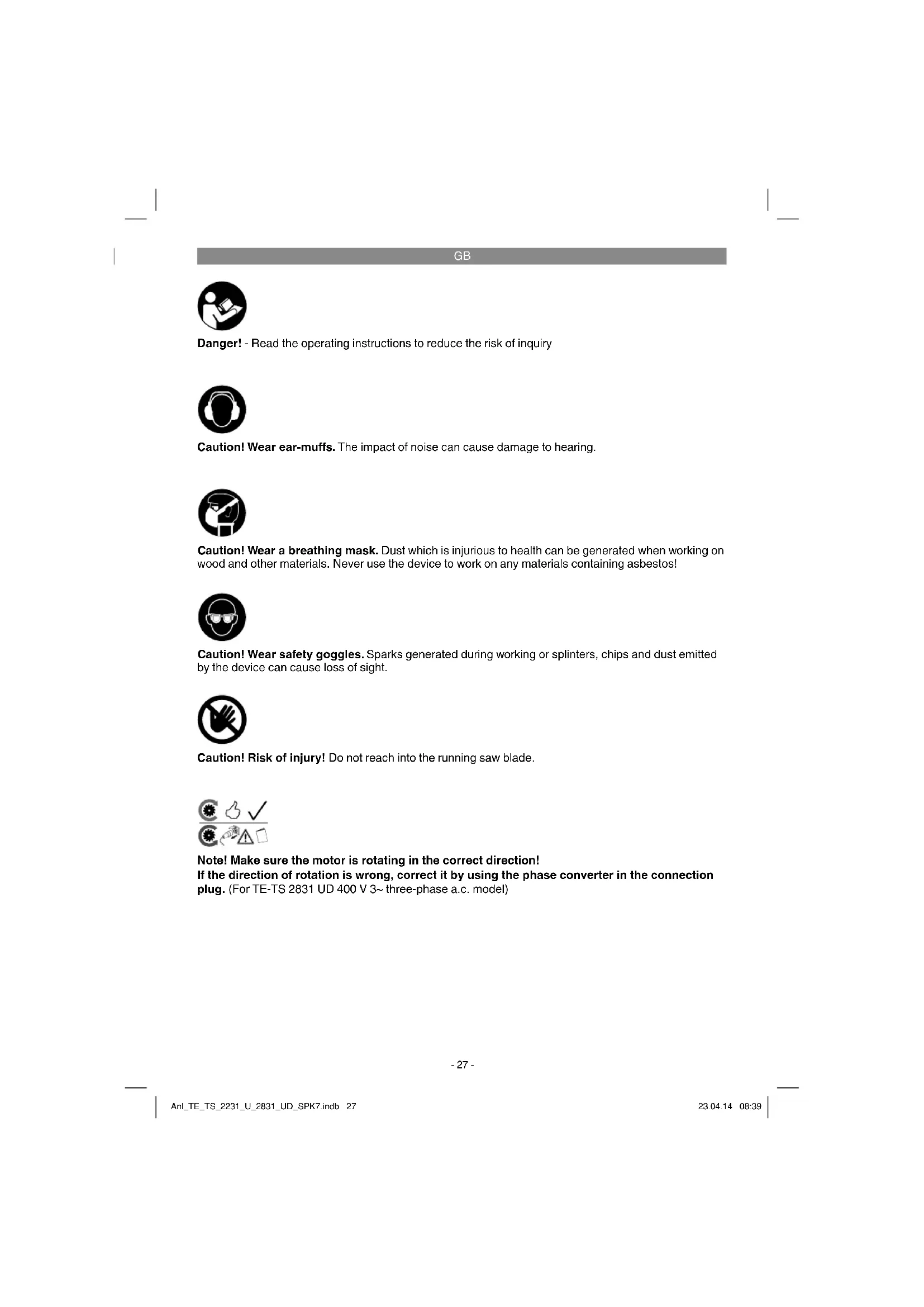 Danger! - Read the operating instructions to reduce the risk of inquiry Caution! Wear ear-muff s. The impact of noise can cause damage to hearing. Caution! Wear safety goggles. Sparks generated during working or splinters, chips and dust emitted by the device can cause loss of sight. Caution! Wear a breathing mask. Dust which is injurious to health can be generated when working on wood and other materials. Never use the device to work on any materials containing asbestos! Caution! Risk of injury! Do not reach into the running saw blade. Note! Make sure the motor is rotating in the correct direction! If the direction of rotation is wrong, correct it by using the phase converter in the connection plug. (For TE-TS 2831 UD 400 V 3~ three-phase a.c. model) Anl_TE_TS_2231_U_2831_UD_SPK7.indb 27Anl_TE_TS_2231_U_2831_UD_SPK7.indb 27 23.04.14 08:3923.04.14 08:39GB