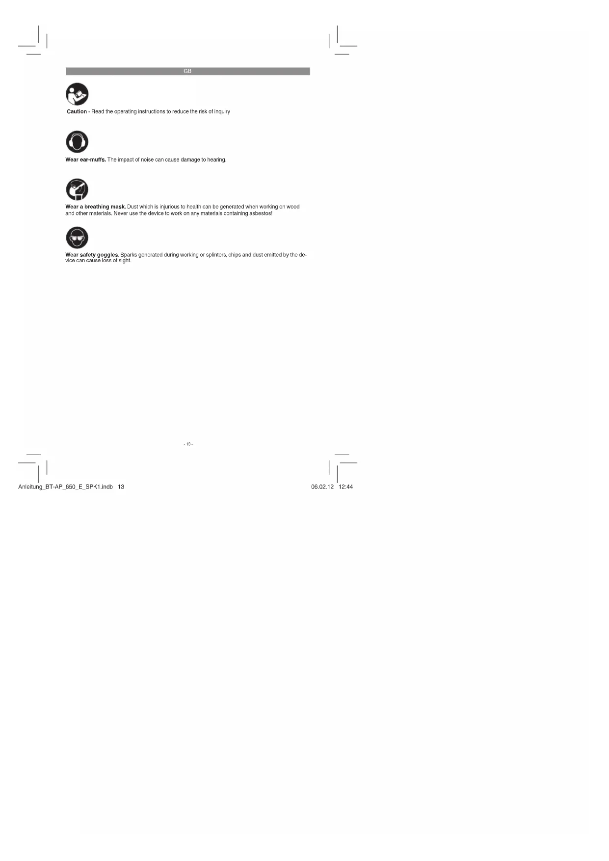 Caution - Read the operating instructions to reduce the risk of inquiry Wear ear-muff s. The impact of noise can cause damage to hearing. Wear safety goggles. Sparks generated during working or splinters, chips and dust emitted by the de- vice can cause loss of sight. Wear a breathing mask. Dust which is injurious to health can be generated when working on wood and other materials. Never use the device to work on any materials containing asbestos! Anleitung_BT-AP_650_E_SPK1.indb 13Anleitung_BT-AP_650_E_SPK1.indb 13 06.02.12 12:4406.02.12 12:44GB Important! When using the equipment, a few safety pre- cautions must be observed to avoid injuries and damage. Please read the complete operating instructions and safety regulations with due care. Keep this manual in a safe place, so that the in- formation is available at all times. If you give the equipment to any other person, hand over these operating instructions and safety regulations as well. We cannot accept any liability for damage or accidents which arise due to a failure to follow these instructions and the safety instructions.