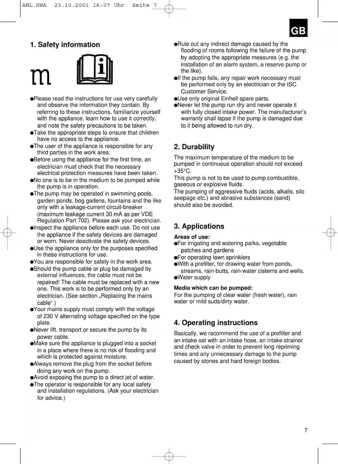 Please read the instructions for use very carefully and observe the information they contain. By referring to these instructions, familiarize yourself with the appliance, learn how to use it correctly, and note the safety precautions to be taken. Take the appropriate steps to ensure that children have no access to the appliance. The user of the appliance is responsible for any third parties in the work area. Before using the appliance for the first time, an electrician must check that the necessary electrical protection measures have been taken. No one is to be in the medium to be pumped while the pump is in operation. The pump may be operated in swimming pools, garden ponds, bog gadens, fountains and the like only with a leakage-current circuit-breaker (maximum leakage current 30 mA as per VDE Regulation Part 702). Please ask your electrician. Inspect the appliance before each use. Do not use the appliance if the safety devices are damaged or worn. Never deactivate the safety devices. Use the appliance only for the purposes specified in these instructions for use. You are responsible for safety in the work area. Should the pump cable or plug be damaged by external influences, the cable must not be repaired! The cable must be replaced with a new one. This work is to be performed only by an electrician. (See section „Replacing the mains cable“.) Your mains supply must comply with the voltage of 230 V alternating voltage specified on the type plate. Never lift, transport or secure the pump by its power cable. Make sure the appliance is plugged into a socket in a place where there is no risk of flooding and which is protected against moisture. Always remove the plug from the socket before doing any work on the pump. Avoid exposing the pump to a direct jet of water. The operator is responsible for any local safety and installation regulations. (Ask your electrician for advice.) Rule out any indirect damage caused by the flooding of rooms following the failure of the pump by adopting the appropriate measures (e.g. the installation of an alarm system, a reserve pump or the like). If the pump fails, any repair work necessary must be performed only by an electrician or the ISC Customer Service. Use only original Einhell spare parts. Never let the pump run dry and never operate it with fully closed intake power. The manufacturer’s warranty shall lapse if the pump is damaged due to it being allowed to run dry.