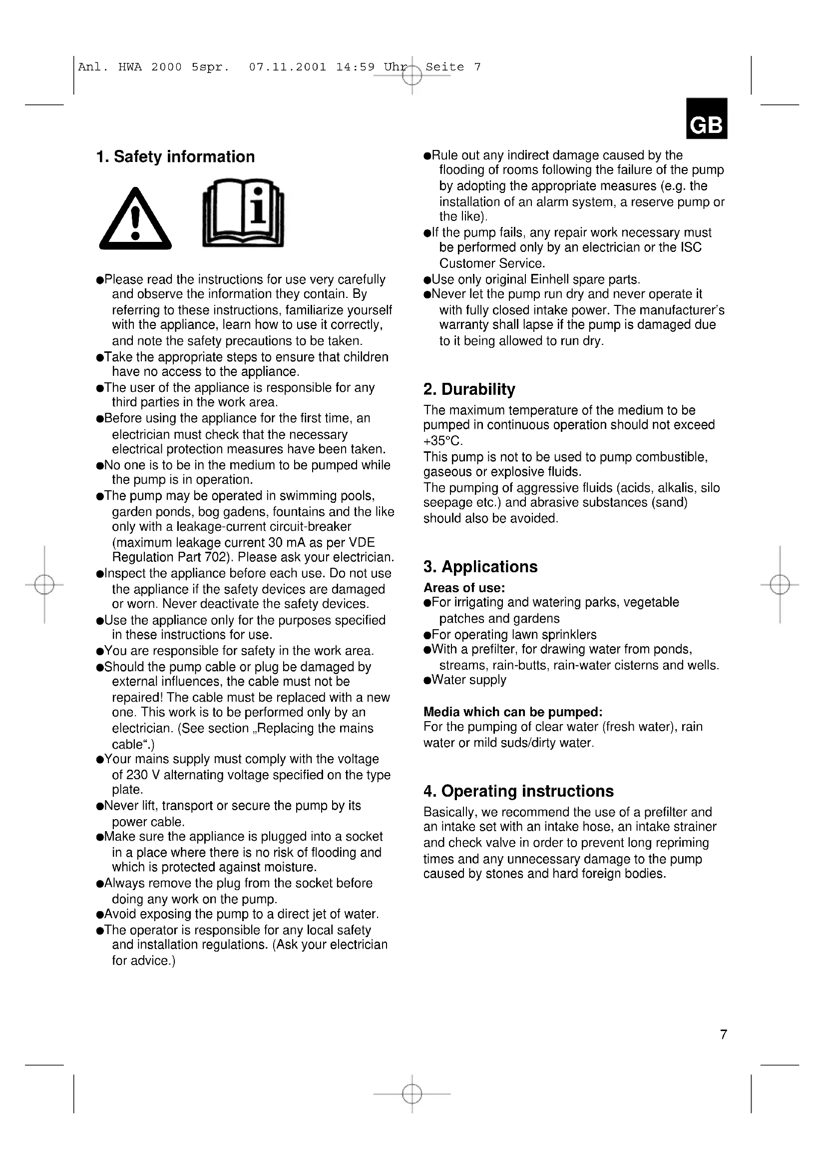 Please read the instructions for use very carefully and observe the information they contain. By referring to these instructions, familiarize yourself with the appliance, learn how to use it correctly, and note the safety precautions to be taken. Take the appropriate steps to ensure that children have no access to the appliance. The user of the appliance is responsible for any third parties in the work area. Before using the appliance for the first time, an electrician must check that the necessary electrical protection measures have been taken. No one is to be in the medium to be pumped while the pump is in operation. The pump may be operated in swimming pools, garden ponds, bog gadens, fountains and the like only with a leakage-current circuit-breaker (maximum leakage current 30 mA as per VDE Regulation Part 702). Please ask your electrician. Inspect the appliance before each use. Do not use the appliance if the safety devices are damaged or worn. Never deactivate the safety devices. Use the appliance only for the purposes specified in these instructions for use. You are responsible for safety in the work area. Should the pump cable or plug be damaged by external influences, the cable must not be repaired! The cable must be replaced with a new one. This work is to be performed only by an electrician. (See section „Replacing the mains cable“.) Your mains supply must comply with the voltage of 230 V alternating voltage specified on the type plate. Never lift, transport or secure the pump by its power cable. Make sure the appliance is plugged into a socket in a place where there is no risk of flooding and which is protected against moisture. Always remove the plug from the socket before doing any work on the pump. Avoid exposing the pump to a direct jet of water. The operator is responsible for any local safety and installation regulations. (Ask your electrician for advice.) Rule out any indirect damage caused by the flooding of rooms following the failure of the pump by adopting the appropriate measures (e.g. the installation of an alarm system, a reserve pump or the like). If the pump fails, any repair work necessary must be performed only by an electrician or the ISC Customer Service. Use only original Einhell spare parts. Never let the pump run dry and never operate it with fully closed intake power. The manufacturer’s warranty shall lapse if the pump is damaged due to it being allowed to run dry.