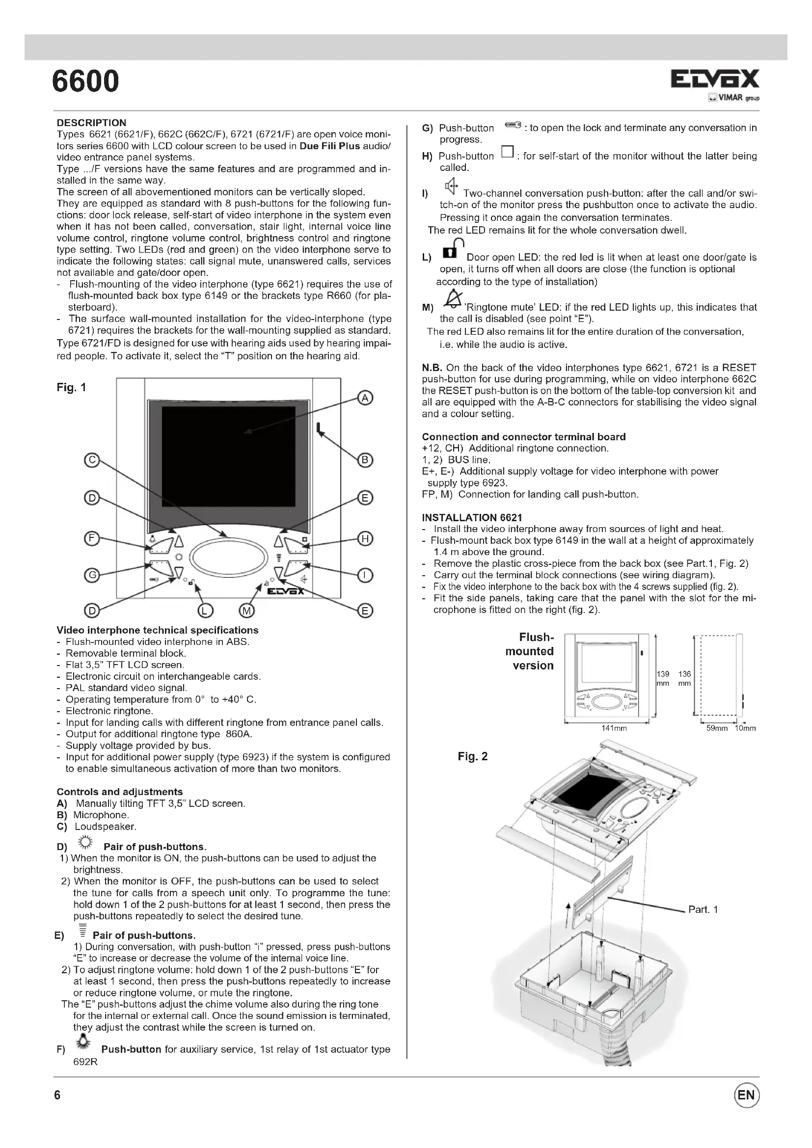 DESCRIPTION Types 6621 (6621/F), 662C (662C/F), 6721 (6721/F) are open voice moni- tors series 6600 with LCD colour screen to be used in Due Fili Plus audio/ video entrance panel systems. Type .../F versions have the same features and are programmed and in- stalled in the same way. The screen of all abovementioned monitors can be vertically sloped. They are equipped as standard with 8 push-buttons for the following fun- ctions: door lock release, self-start of video interphone in the system even when it has not been called, conversation, stair light, internal voice line volume control, ringtone volume control, brightness control and ringtone type setting. Two LEDs (red and green) on the video interphone serve to indicate the following states: call signal mute, unanswered calls, services not available and gate/door open. - Flush-mounting of the video interphone (type 6621) requires the use of flush-mounted back box type 6149 or the brackets type R660 (for pla- sterboard). - The surface wall-mounted installation for the video-interphone (type 6721) requires the brackets for the wall-mounting supplied as standard. Type 6721/FD is designed for use with hearing aids used by hearing impai- red people. To activate it, select the “T” position on the hearing aid. Video interphone technical specifications - Flush-mounted video interphone in ABS. - Removable terminal block. - Flat 3,5” TFT LCD screen. - Electronic circuit on interchangeable cards. - PAL standard video signal. - Operating temperature from 0° to +40° C. - Electronic ringtone. - Input for landing calls with different ringtone from entrance panel calls. - Output for additional ringtone type 860A. - Supply voltage provided by bus. - Input for additional power supply (type 6923) if the system is configured to enable simultaneous activation of more than two monitors. Controls and adjustments A) Manually tilting TFT 3,5” LCD screen. B) Microphone. C) Loudspeaker.