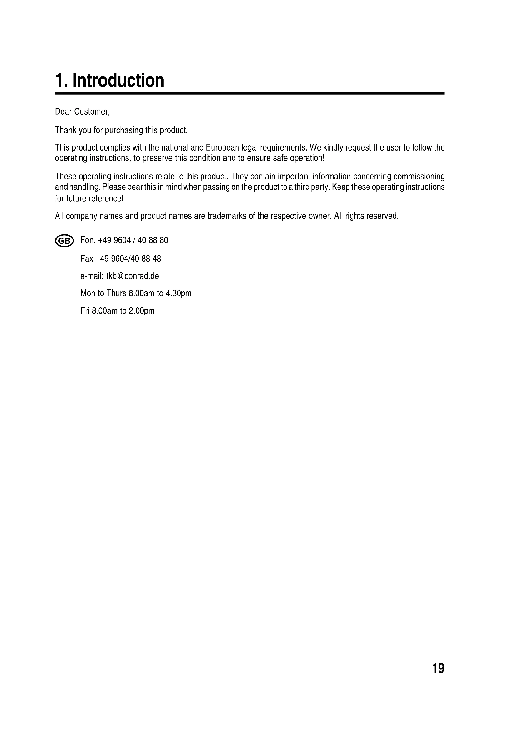Fon. +49 9604 / 40 88 80 Fax +49 9604/40 88 48 e-mail: tkb@conrad.de Mon to Thurs 8.00am to 4.30pm Fri 8.00am to 2.00pm20