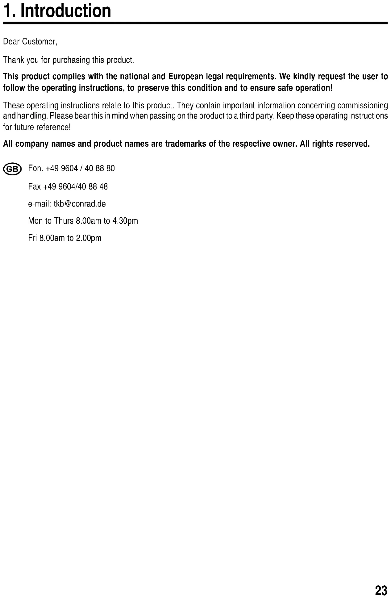 Fon. +49 9604 / 40 88 80 Fax +49 9604/40 88 48 e-mail: tkb@conrad.de Mon to Thurs 8.00am to 4.30pm Fri 8.00am to 2.00pm24