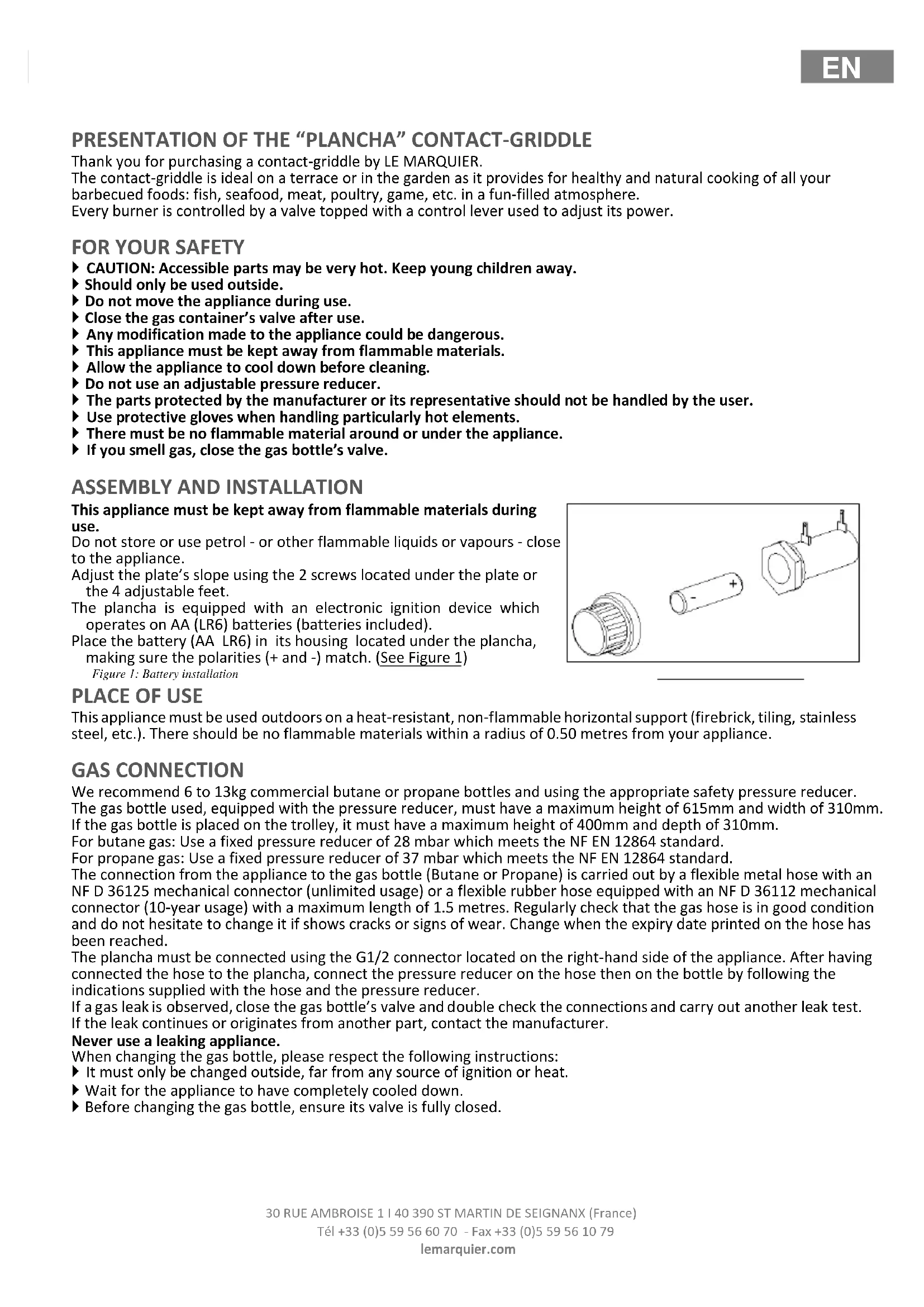 This appliance must be used outdoors on a heat-resistant, non-flammable horizontal support (firebrick, tiling, stainless steel, etc.). There should be no flammable materials within a radius of 0.50 metres from your appliance. GAS CONNECTION We recommend 6 to 13kg commercial butane or propane bottles and using the appropriate safety pressure reducer. The gas bottle used, equipped with the pressure reducer, must have a maximum height of 615mm and width of 310mm. If the gas bottle is placed on the trolley, it must have a maximum height of 400mm and depth of 310mm. For butane gas: Use a fixed pressure reducer of 28 mbar which meets the NF EN 12864 standard. For propane gas: Use a fixed pressure reducer of 37 mbar which meets the NF EN 12864 standard. The connection from the appliance to the gas bottle (Butane or Propane) is carried out by a flexible metal hose with an NF D 36125 mechanical connector (unlimited usage) or a flexible rubber hose equipped with an NF D 36112 mechanical connector (10-year usage) with a maximum length of 1.5 metres. Regularly check that the gas hose is in good condition and do not hesitate to change it if shows cracks or signs of wear. Change when the expiry date printed on the hose has been reached. The plancha must be connected using the G1/2 connector located on the right-hand side of the appliance. After having connected the hose to the plancha, connect the pressure reducer on the hose then on the bottle by following the indications supplied with the hose and the pressure reducer. If a gas leak is observed, close the gas bottle’s valve and double check the connections and carry out another leak test. If the leak continues or originates from another part, contact the manufacturer. Never use a leaking appliance. When changing the gas bottle, please respect the following instructions: It must only be changed outside, far from any source of ignition or heat. Wait for the appliance to have completely cooled down. Before changing the gas bottle, ensure its valve is fully closed.EN 30 RUE AMBROISE 1 I 40 390 ST MARTIN DE SEIGNANX (France) Tél +33 (0)5 59 56 60 70 - Fax +33 (0)5 59 56 10 79 lemarquier.com