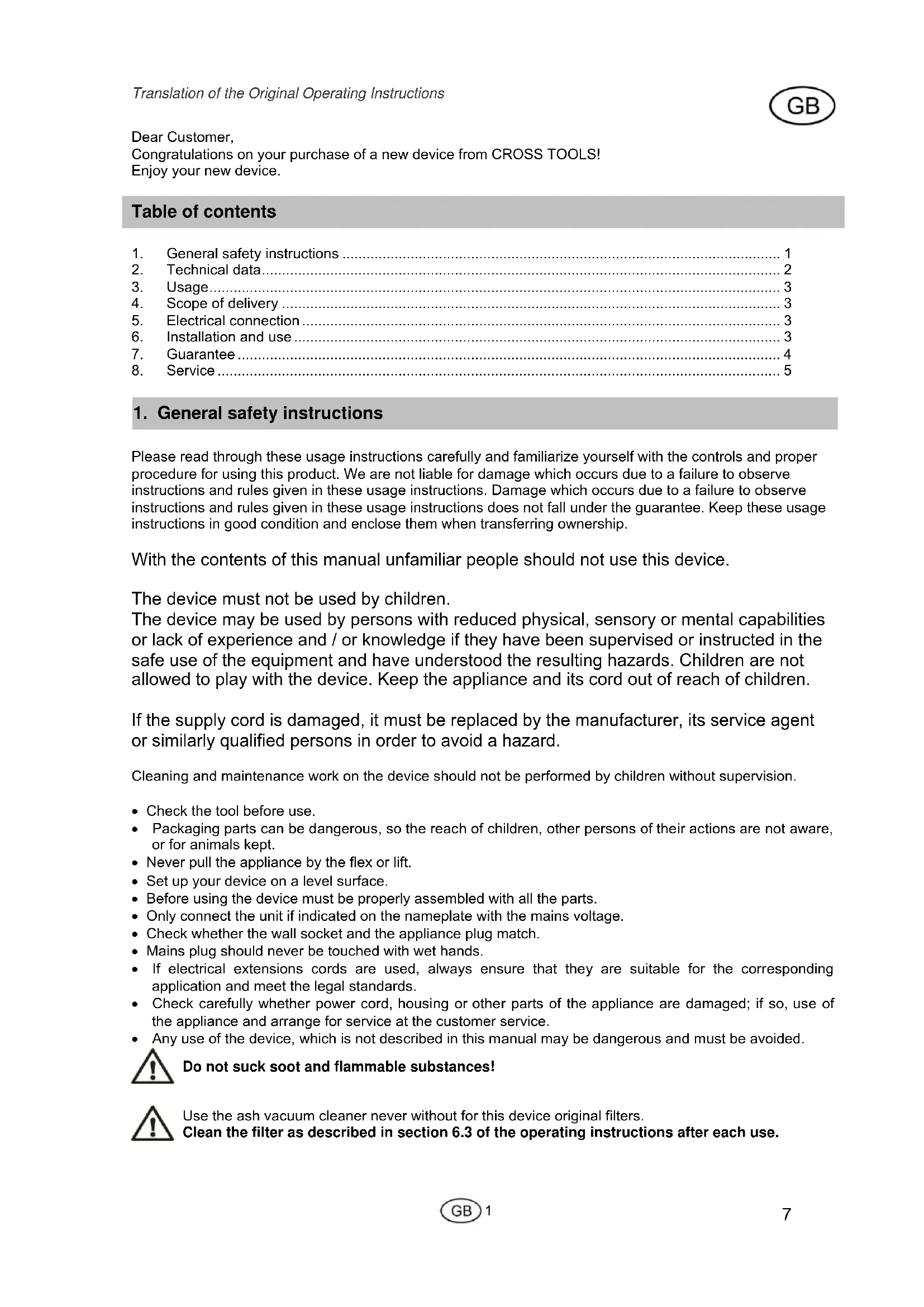 Original operating instructions – Ash vacuum cleaner