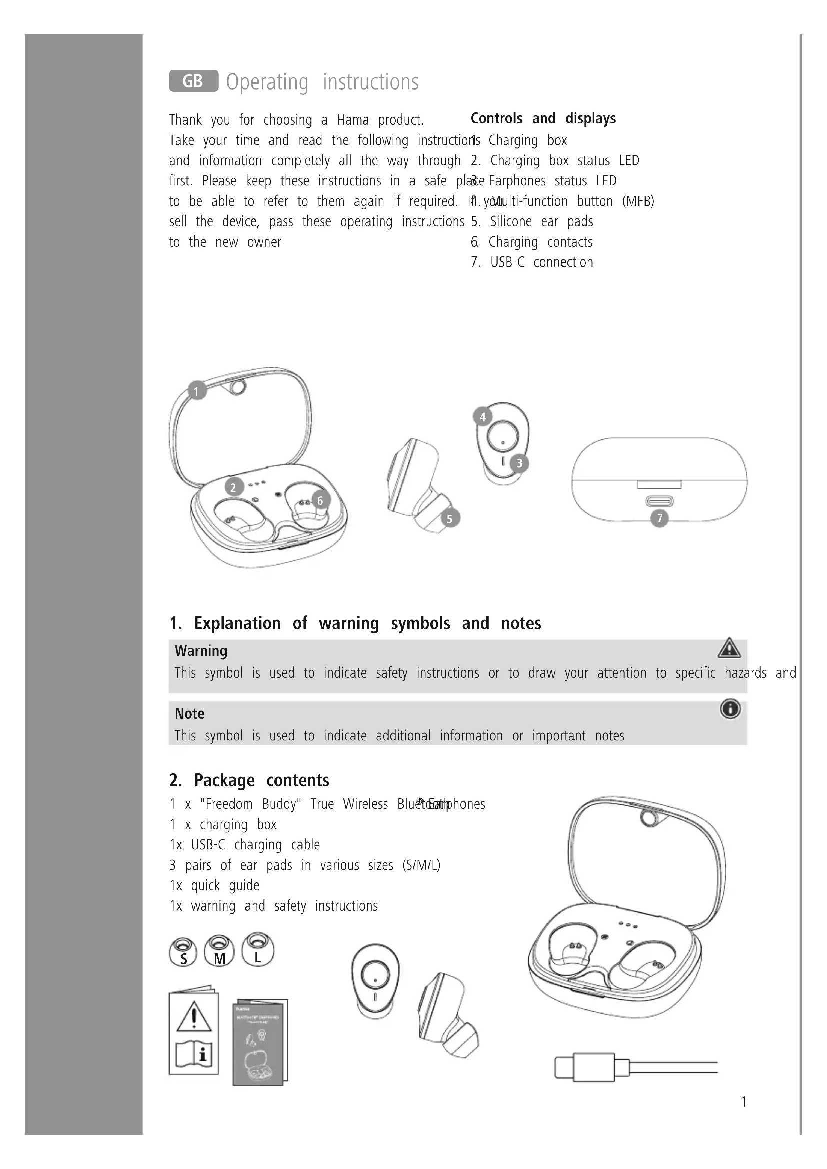 Earphones 1 x charging box 1x USB-C charging cable 3 pairs of ear pads in various sizes (S/M/L) 1x quick guide 1x warning and safety instructions
