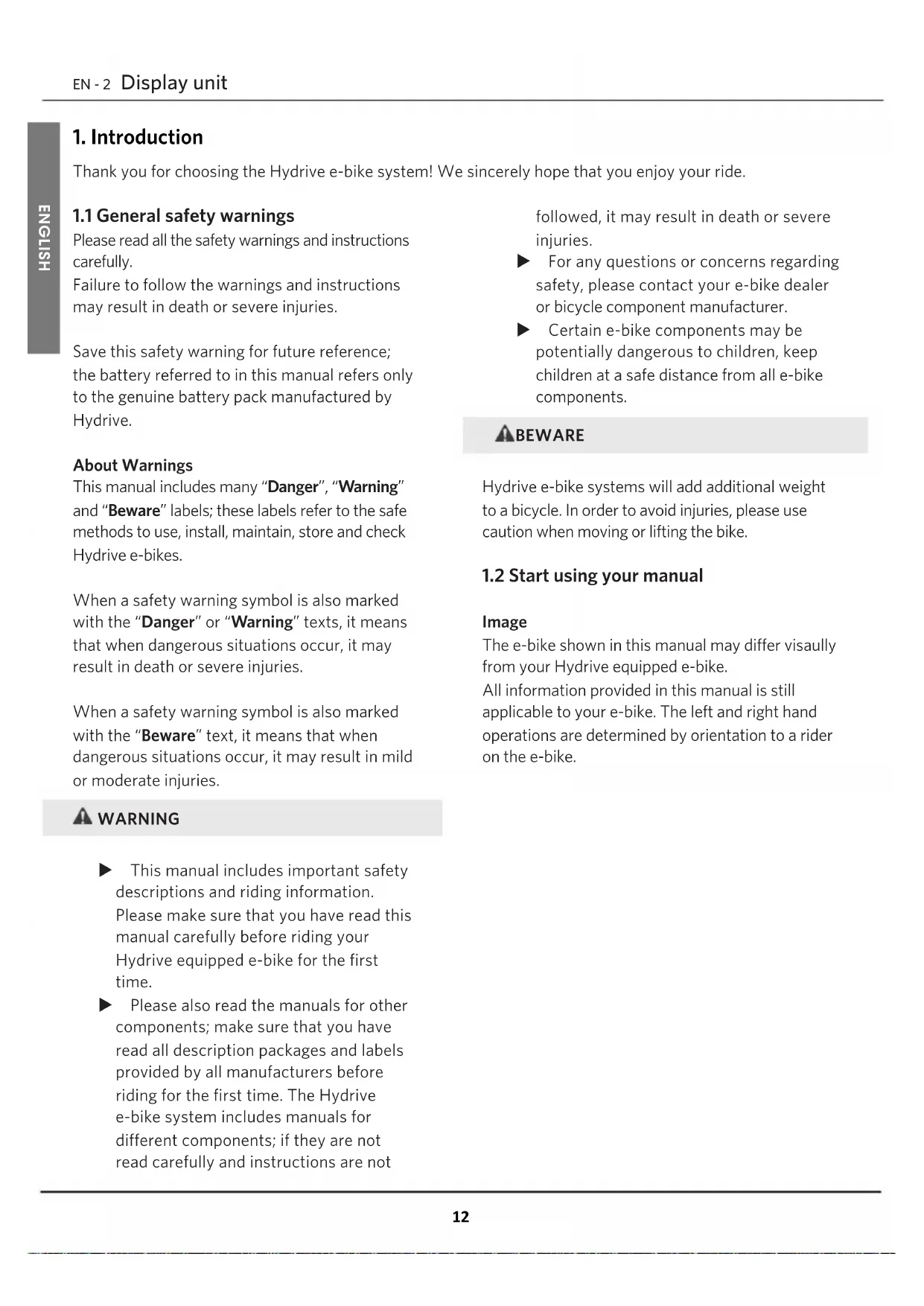 Thank you for choosing the Hydrive e-bike system! We sincerely hope that you enjoy your ride. EN - 2 Battery read carefully and instructions are not followed, it may result in death or severe injuries. X For any questions or concerns regarding safety, please contact your e-bike dealer or bicycle component manufacturer. X Certain e-bike components may be potentially dangerous to children, keep children at a safe distance from all e-bike components. BEWARE Hydrive e-bike systems will add additional weight to a bicycle. In order to avoid injuries, please use caution when moving or lifting the bike.