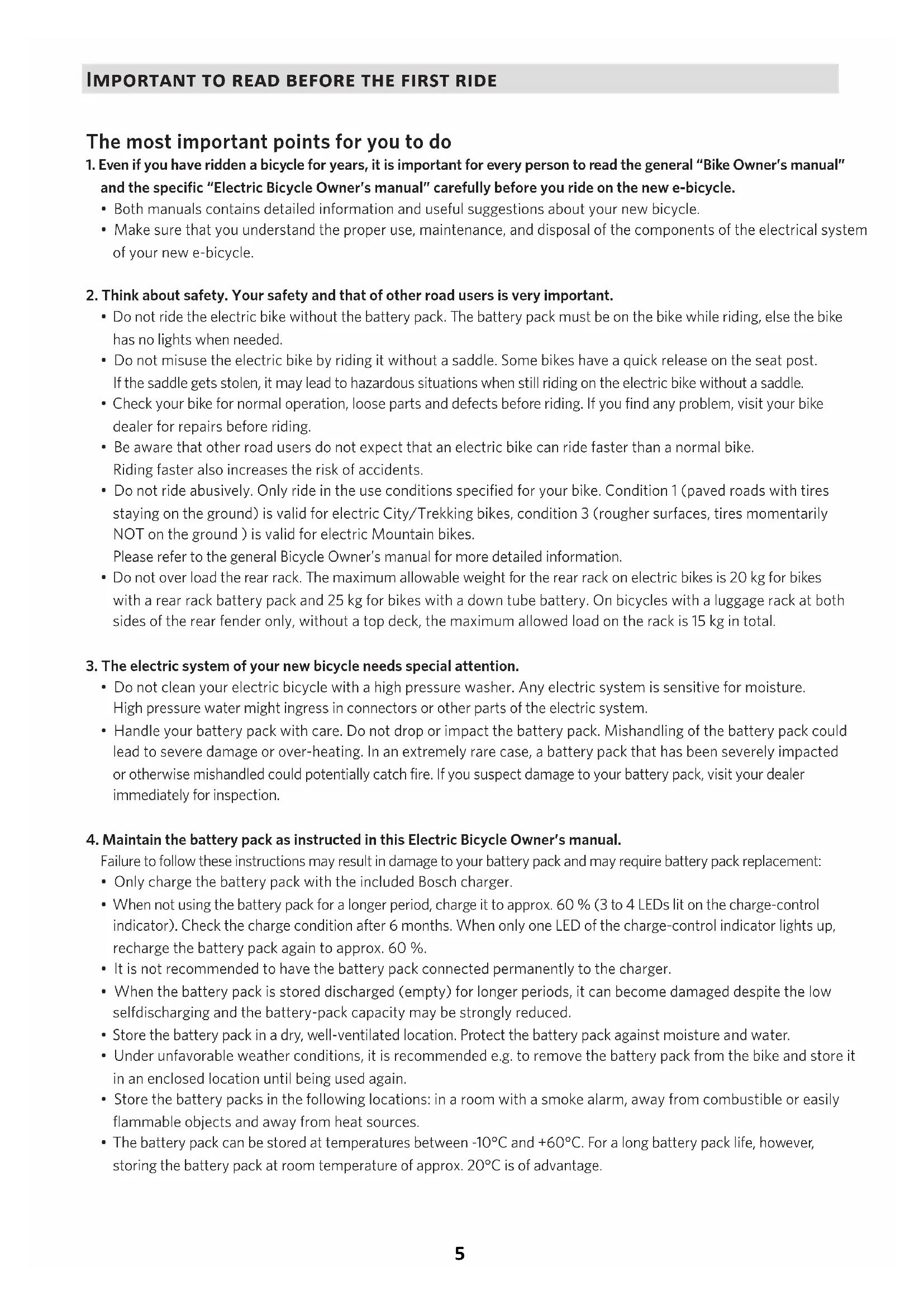 Contact - Kontakt - Contact - Contacter.................................................................................................................................................................................................. 371Important to read before the first ride The most important points for you to do 1. Even if you have ridden a bicycle for years, it is important for every person to read the general “Bike Owner’s manual” and the specific “Electric Bicycle Owner’s manual” carefully before you ride on the new e-bicycle.