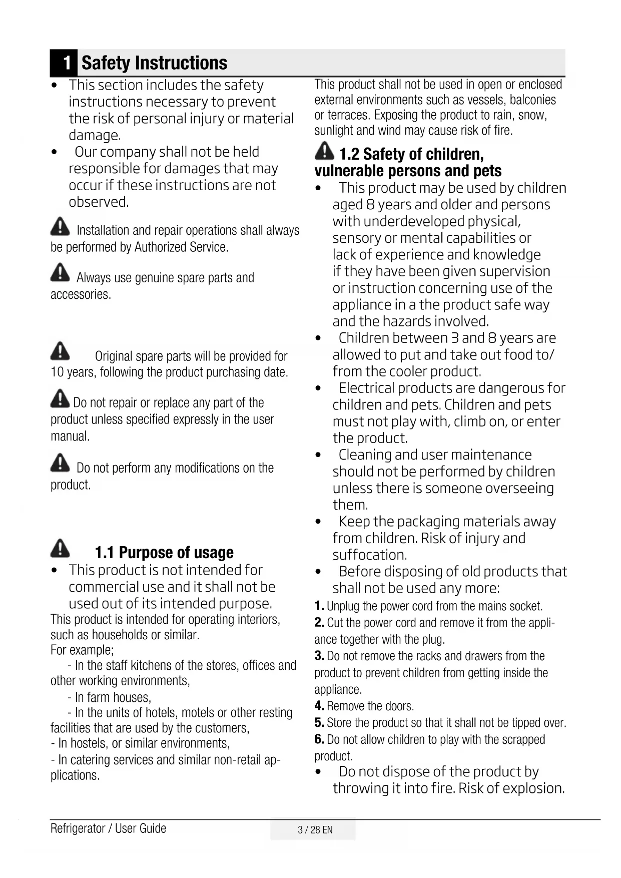 8 Troubleshooting 253 / 28 EN Refrigerator / User Guide 1 Safety Instructions t This section includes the safety instructions necessary to prevent the risk of personal injury or material damage. t Our company shall not be held responsible for damages that may occur if these instructions are not observed. Installation and repair operations shall always be performed by Authorized Service. Always use genuine spare parts and accessories. Original spare parts will be provided for 10 years, following the product purchasing date. Do not repair or replace any part of the product unless specified expressly in the user manual. Do not perform any modifications on the product.