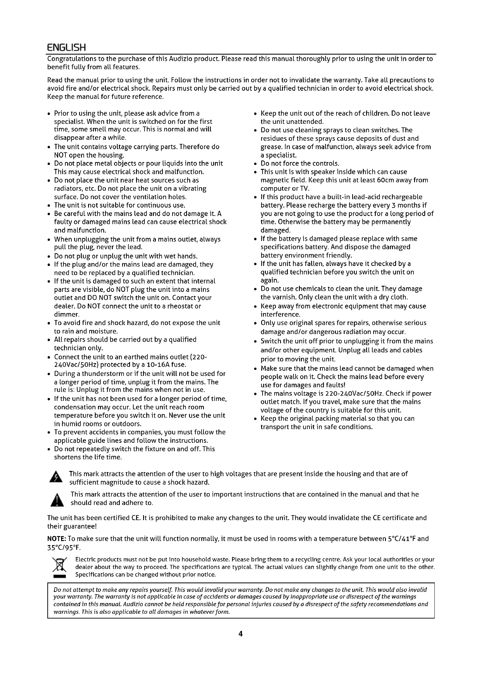 Do not attempt to make any repairs yourself. This would invalid your warranty. Do not make any changes to the unit. This would also invalid your warranty. The warranty is not applicable in case of accidents or damages caused by inappropriate use or disrespect of the warnings contained in this manual. Audizio cannot be held responsible for personal injuries caused by a disrespect of the safety recommendations and warnings. This is also applicable to all damages in whatever form.5 CAUTION! Carefully unpack the box upon receipt. Check the contents to ensure that all parts are present and have been received in good condition. Notify the shipper immediately and retain packaging material if any parts appear damaged from shipping or the package itself shows signs of mishandling. Save the package and all packaging materials. If the product must be returned, it is important that the product is returned in the original factory box and packaging. If the device has been exposed to drastic temperature fluctuation (e.g. after transportation), do not switch it on immediately. The arising condensation water might damage your device. Leave the device switched off until it has reached room temperature. On the label on the backside of the product is indicated on this type of power supply must be connected. Check that the mains voltage corresponds to this, all other voltages than specified, the device can be irreparably damaged. The product must also be directly connected to the mains and may be used. No dimmer or adjustable power supply. Always connect the device to a protected circuit (circuit breaker or fuse). Make sure the device has an appropriate electrical ground to avoid the risk of electrocution or fire.
