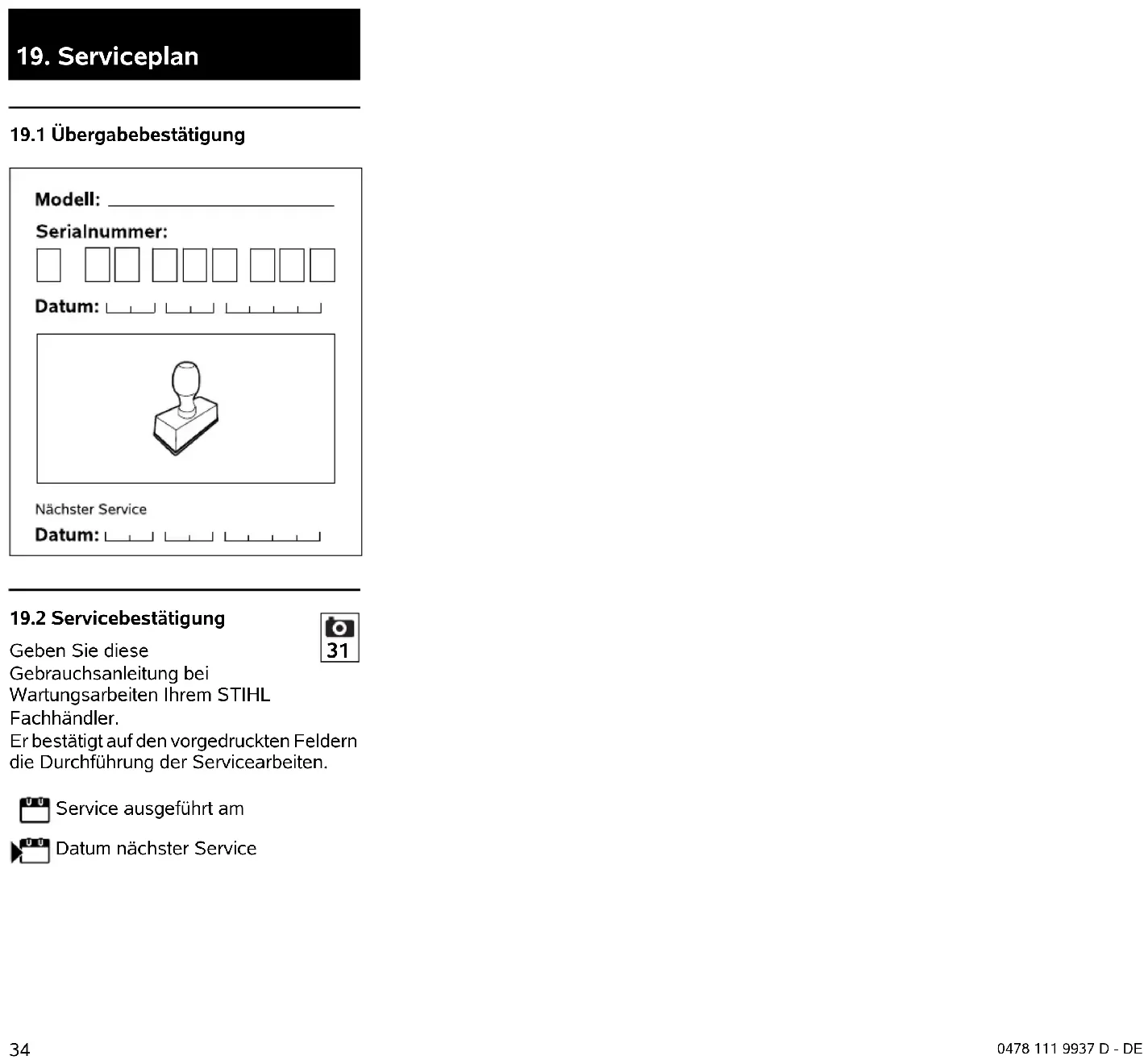 Please hand this instruction manual to your STIHL specialist dealer in the case of maintenance operations. He will confirm the service operations performed in the pre-printed boxes.