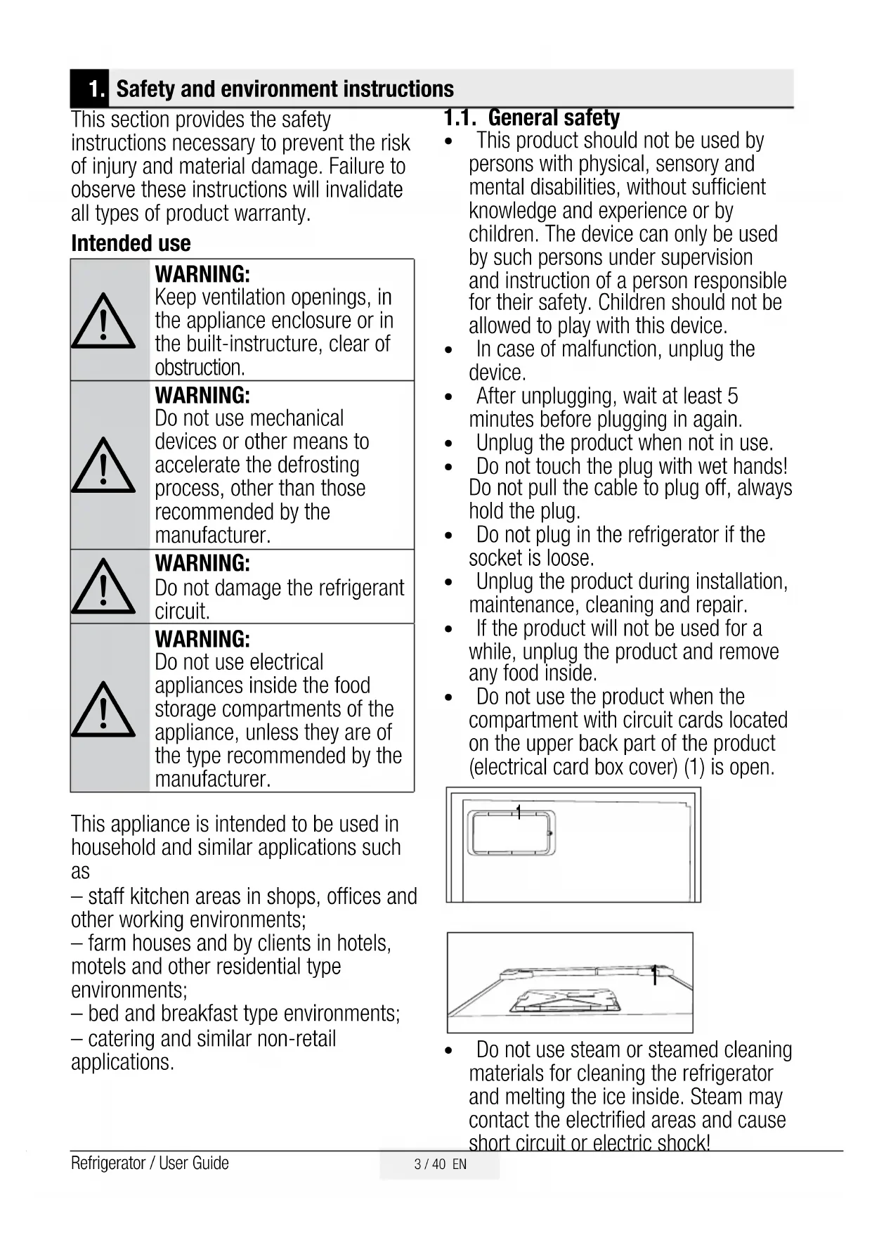 – staff kitchen areas in shops, offices and other working environments; – farm houses and by clients in hotels, motels and other residential type environments; – bed and breakfast type environments; – catering and similar non-retail applications. 1.1. General safety t This product should not be used by persons with physical, sensory and mental disabilities, without sufficient knowledge and experience or by children. The device can only be used by such persons under supervision and instruction of a person responsible for their safety. Children should not be allowed to play with this device. t In case of malfunction, unplug the device. t After unplugging, wait at least 5 minutes before plugging in again. t Unplug the product when not in use.t Do not touch the plug with wet hands! Do not pull the cable to plug off, always hold the plug. t Do not plug in the refrigerator if the socket is loose. t Unplug the product during installation, maintenance, cleaning and repair. t If the product will not be used for a while, unplug the product and remove any food inside. t Do not use the product when the compartment with circuit cards located on the upper back part of the product (electrical card box cover) (1) is open.