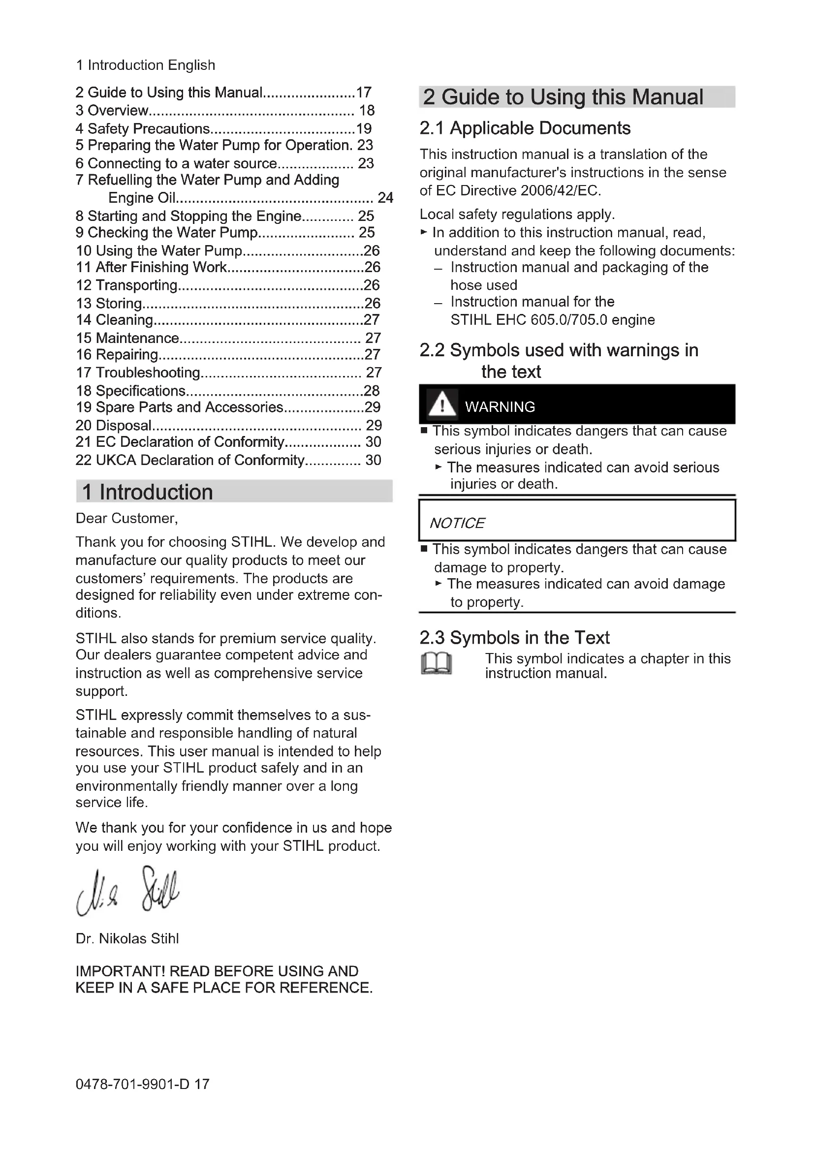 - 22 UKCA Declaration of Conformity 1 Introduction Dear Customer, Thank you for choosing STIHL. We develop and manufacture our quality products to meet our customers’ requirements. The products are designed for reliability even under extreme con‐ ditions. STIHL also stands for premium service quality. Our dealers guarantee competent advice and instruction as well as comprehensive service support. STIHL expressly commit themselves to a sus‐ tainable and responsible handling of natural resources. This user manual is intended to help you use your STIHL product safely and in an environmentally friendly manner over a long service life. We thank you for your confidence in us and hope you will enjoy working with your STIHL product. Dr. Nikolas Stihl p. 30