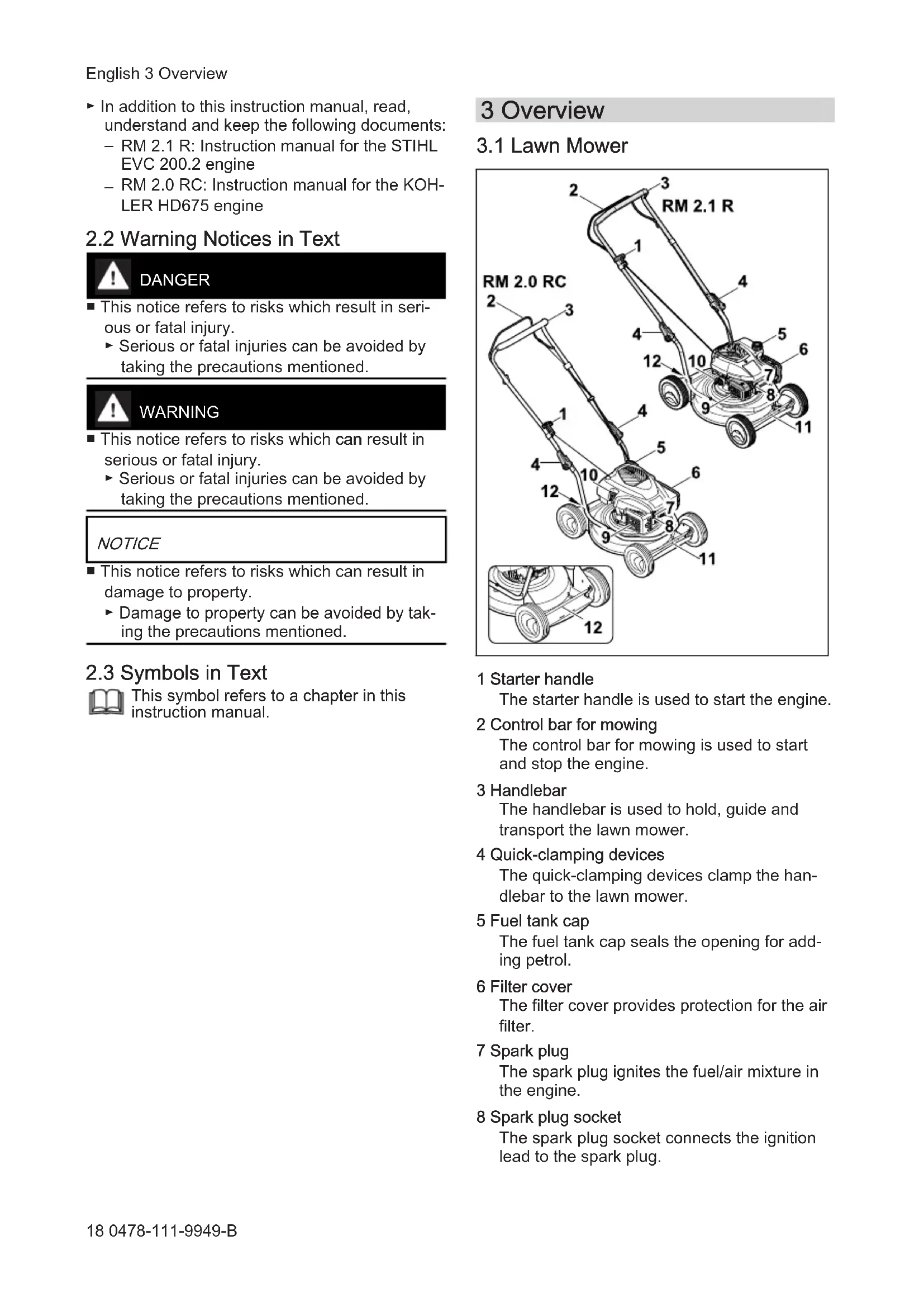 1 Starter handle The starter handle is used to start the engine. 2 Control bar for mowing The control bar for mowing is used to start and stop the engine. 3 Handlebar The handlebar is used to hold, guide and transport the lawn mower. 4 Quick-clamping devices The quick-clamping devices clamp the han‐ dlebar to the lawn mower. 5 Fuel tank cap The fuel tank cap seals the opening for add‐ ing petrol. 6 Filter cover The filter cover provides protection for the air filter. 7 Spark plug The spark plug ignites the fuel/air mixture in the engine. 8 Spark plug socket The spark plug socket connects the ignition lead to the spark plug. English 3 Overview 18 0478-111-9949-B9 Muffler The muffler reduces the lawn mower's noise level. 10 Engine oil cap The engine oil cap seals the opening for add‐ ing engine oil. 11 Front cutting height adjustment mechanism The cutting height adjustment mechanism is used to set the cutting height. 12 Rear cutting height adjustment mechanism The cutting height adjustment mechanism is used to set the cutting height.