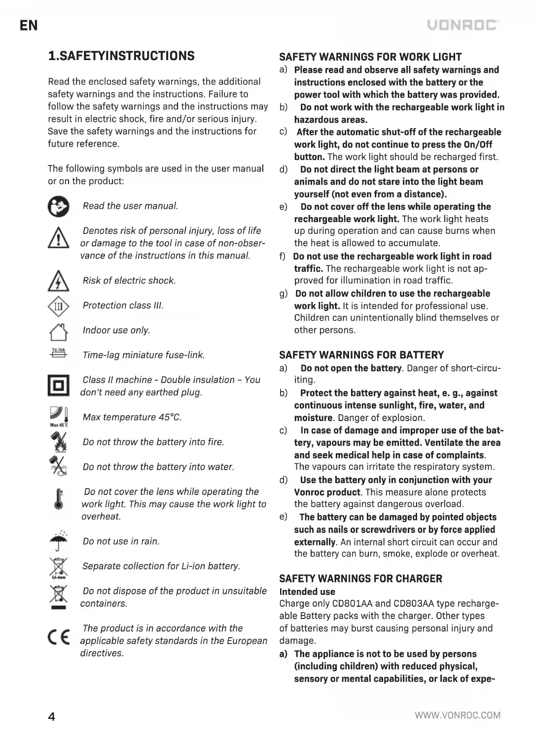 Read the enclosed safety warnings, the additional safety warnings and the instructions. Failure to follow the safety warnings and the instructions may result in electric shock, fire and/or serious injury. Save the safety warnings and the instructions for future reference. The following symbols are used in the user manual or on the product: Read the user manual. Denotes risk of personal injury, loss of life or damage to the tool in case of non-obser- vance of the instructions in this manual. Risk of electric shock. Protection class III. Indoor use only. Time-lag miniature fuse-link. Class II machine - Double insulation – You don’t need any earthed plug. Max temperature 45°C. Do not throw the battery into fire. Do not throw the battery into water. Do not cover the lens while operating the work light. This may cause the work light to overheat. Do not use in rain. Separate collection for Li-ion battery. Do not dispose of the product in unsuitable containers. The product is in accordance with the applicable safety standards in the European directives.