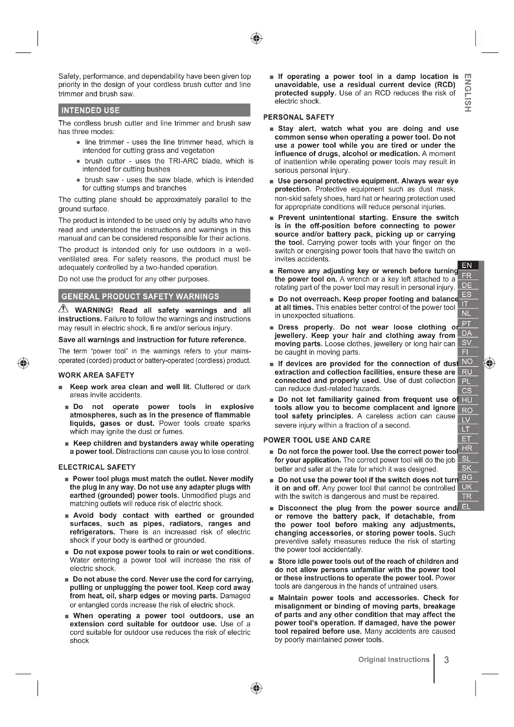 Original Instructions Safety, performance, and dependability have been given top priority in the design of your cordless brush cutter and line trimmer and brush saw. INTENDED USE The cordless brush cutter and line trimmer and brush saw has three modes: ● line trimmer - uses the line trimmer head, which is intended for cutting grass and vegetation ● brush cutter - uses the TRI-ARC blade, which is intended for cutting bushes ● brush saw - uses the saw blade, which is intended for cutting stumps and branches The cutting plane should be approximately parallel to the ground surface. The product is intended to be used only by adults who have read and understood the instructions and warnings in this manual and can be considered responsible for their actions. The product is intended only for use outdoors in a well- ventilated area. For safety reasons, the product must be adequately controlled by a two-handed operation. Do not use the product for any other purposes.