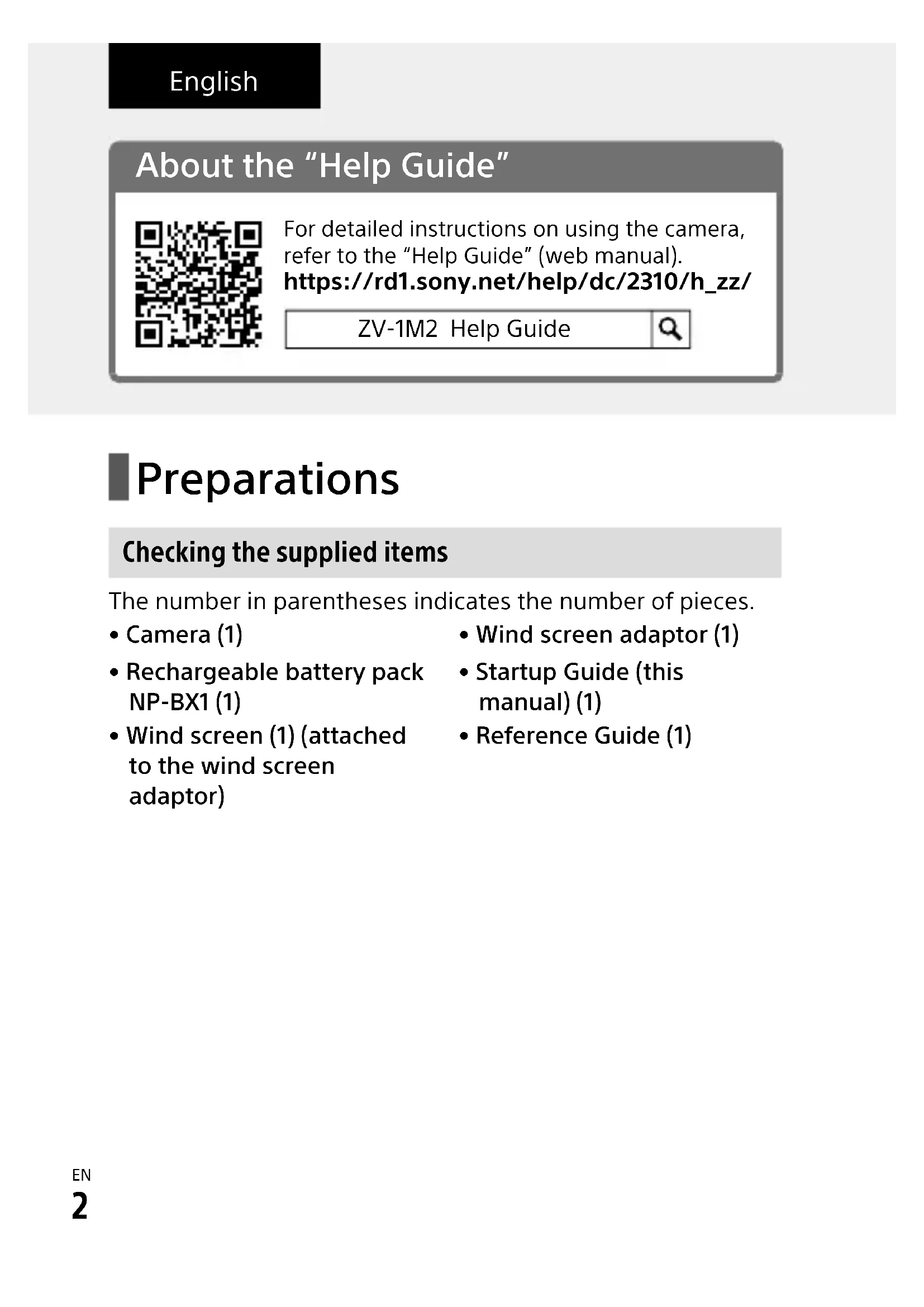 About the “Help Guide” For detailed instructions on using the camera, refer to the “Help Guide” (web manual).https://rd1.sony.net/help/dc/2310/h_zz/ZV-1M2 Help Guide English Preparations Checking the supplied items The number in parentheses indicates the number of pieces.• Camera (1)• Rechargeable battery pack NP-BX1 (1)• Wind screen (1) (attached to the wind screen adaptor)• Wind screen adaptor (1)• Startup Guide (this manual) (1)• Reference Guide (1)EN