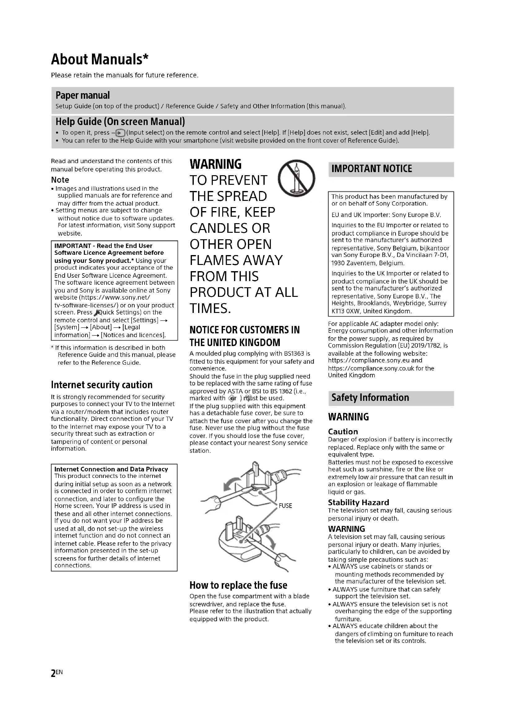 A moulded plug complying with BS1363 is fitted to this equipment for your safety and convenience.Should the fuse in the plug supplied need to be replaced with the same rating of fuse approved by ASTA or BSI to BS 1362 (i.e., marked with or ) must be used.If the plug supplied with this equipment has a detachable fuse cover, be sure to attach the fuse cover after you change the fuse. Never use the plug without the fuse cover. If you should lose the fuse cover, please contact your nearest Sony service station. How to replace the fuse Open the fuse compartment with a blade screwdriver, and replace the fuse.Please refer to the illustration that actually equipped with the product.For applicable AC adapter model only:Energy consumption and other information for the power supply, as required by Commission Regulation (EU) 2019/1782, is available at the following website:https://compliance.sony.eu andhttps://compliance.sony.co.uk for the United Kingdom WARNING Caution Danger of explosion if battery is incorrectly replaced. Replace only with the same or equivalent type.Batteries must not be exposed to excessive heat such as sunshine, fire or the like or extremely low air pressure that can result in an explosion or leakage of flammable liquid or gas. Stability Hazard The television set may fall, causing serious personal injury or death. WARNING A television set may fall, causing serious personal injury or death. Many injuries, particularly to children, can be avoided by taking simple precautions such as:• ALWAYS use cabinets or stands or mounting methods recommended by the manufacturer of the television set.• ALWAYS use furniture that can safely support the television set.• ALWAYS ensure the television set is not overhanging the edge of the supporting furniture.• ALWAYS educate children about the dangers of climbing on furniture to reach the television set or its controls. About Manuals* Please retain the manuals for future reference. Paper manual Setup Guide (on top of the product) / Reference Guide / Safety and Other Information (this manual). Help Guide (On screen Manual)